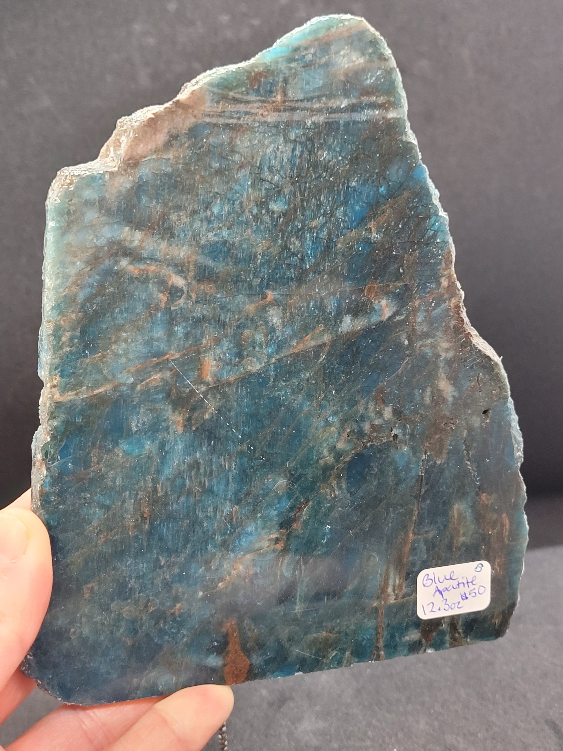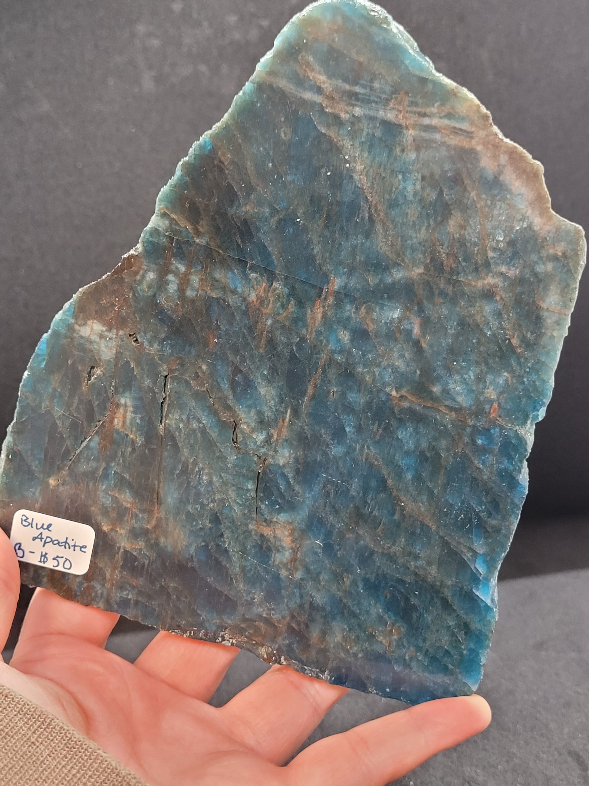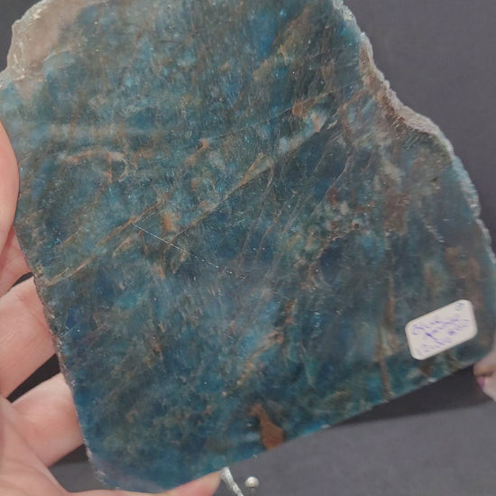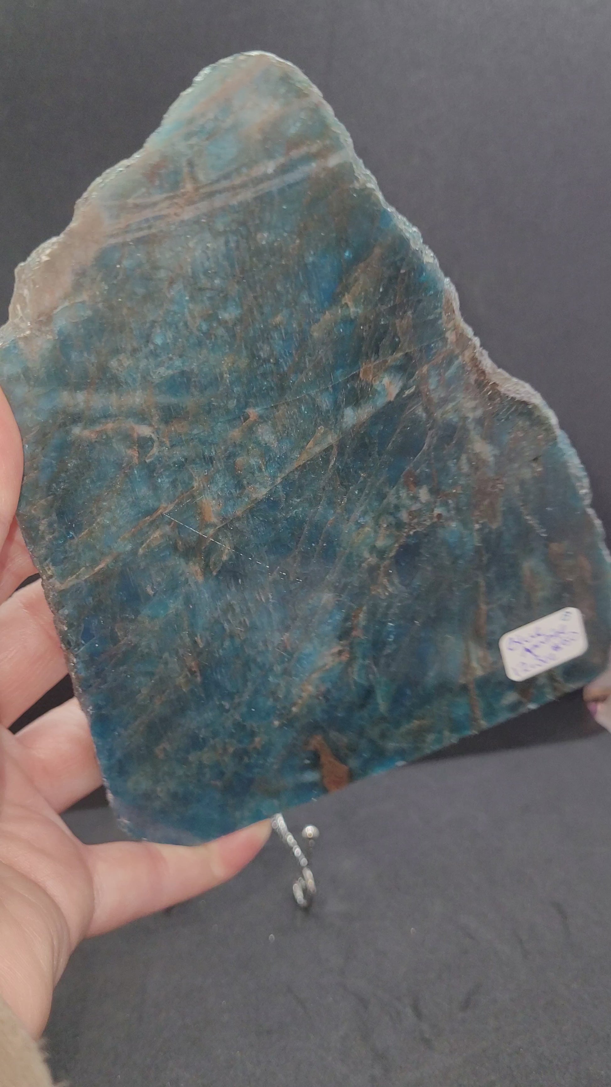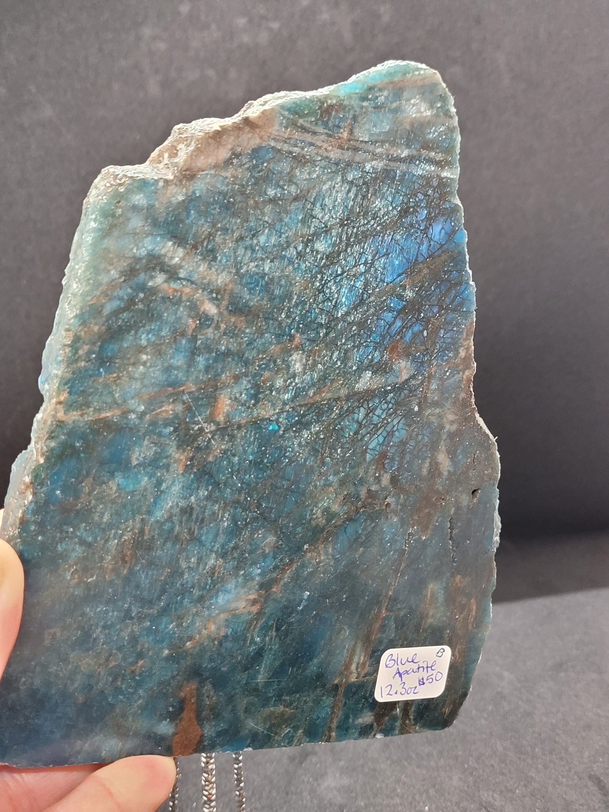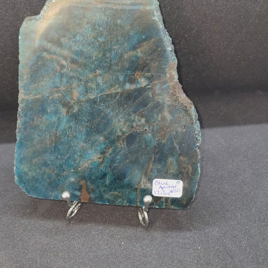 Dark Blue Apatite slabs presented with complementary stands. These specimens facilitate throat chakra alignment, enhancing verbal articulation and authentic self-expression. The metaphysical properties include cognitive clarity, creative stimulation, and internal fortitude development. Blue Apatite serves as a conduit for intuitive insights and transcendent connections, effectively dissolving communication barriers. This mineral empowers individuals to articulate their genuine perspectives with confidence and clarity.