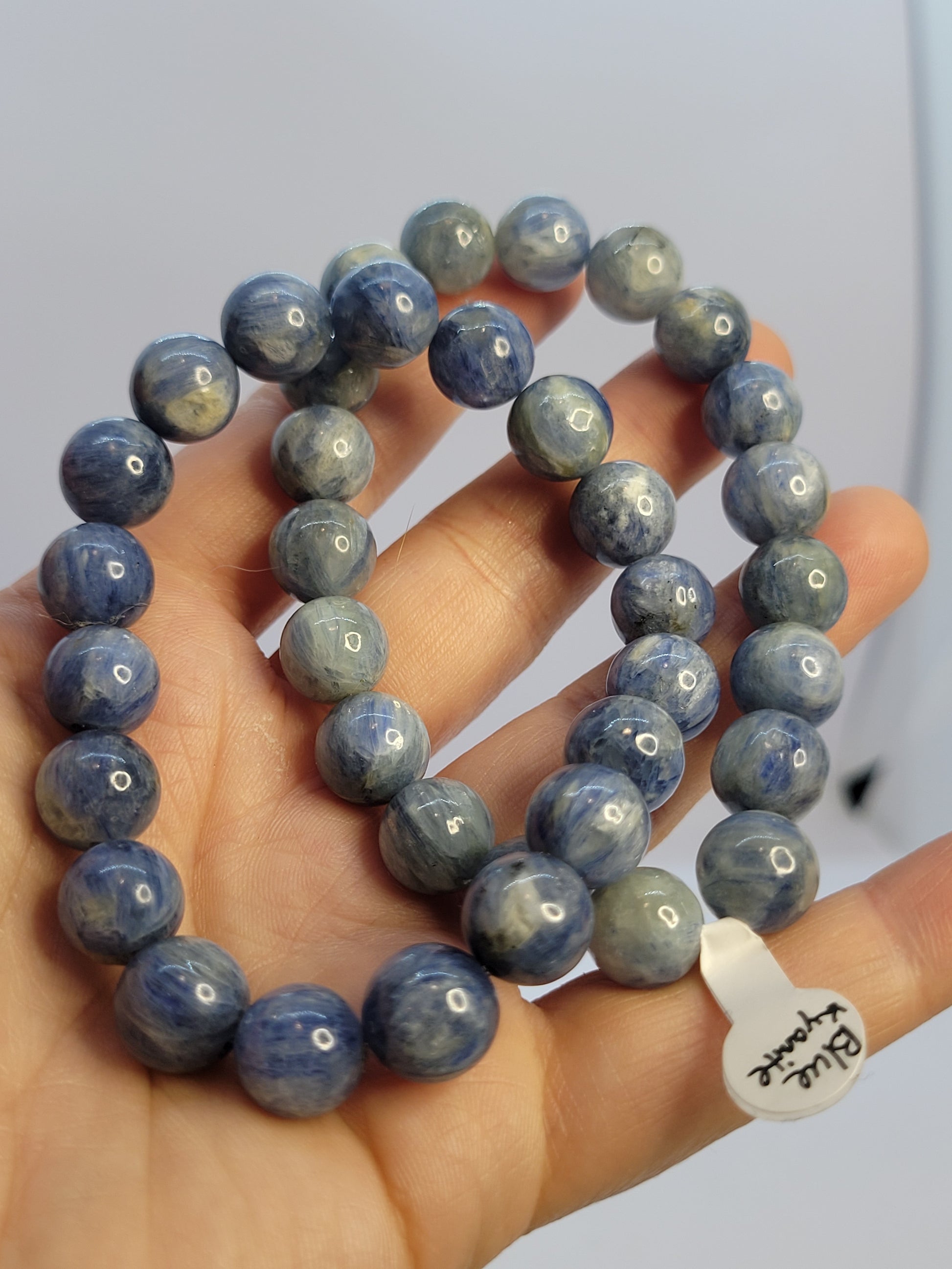 Expertly crafted 10mm Blue Kyanite bracelet featuring elegant silver accents. This powerful stone facilitates clear communication through its throat chakra connection, while simultaneously reducing stress and balancing energy centers. Blue Kyanite supports enhanced intuition, deepens meditation practices, and creates tranquility. Valued for its ability to strengthen self-expression and public speaking confidence, this crystal also promotes psychic development and spiritual exploration, including astral projection. The perfect companion for those seeking both metaphysical benefits and sophisticated style.