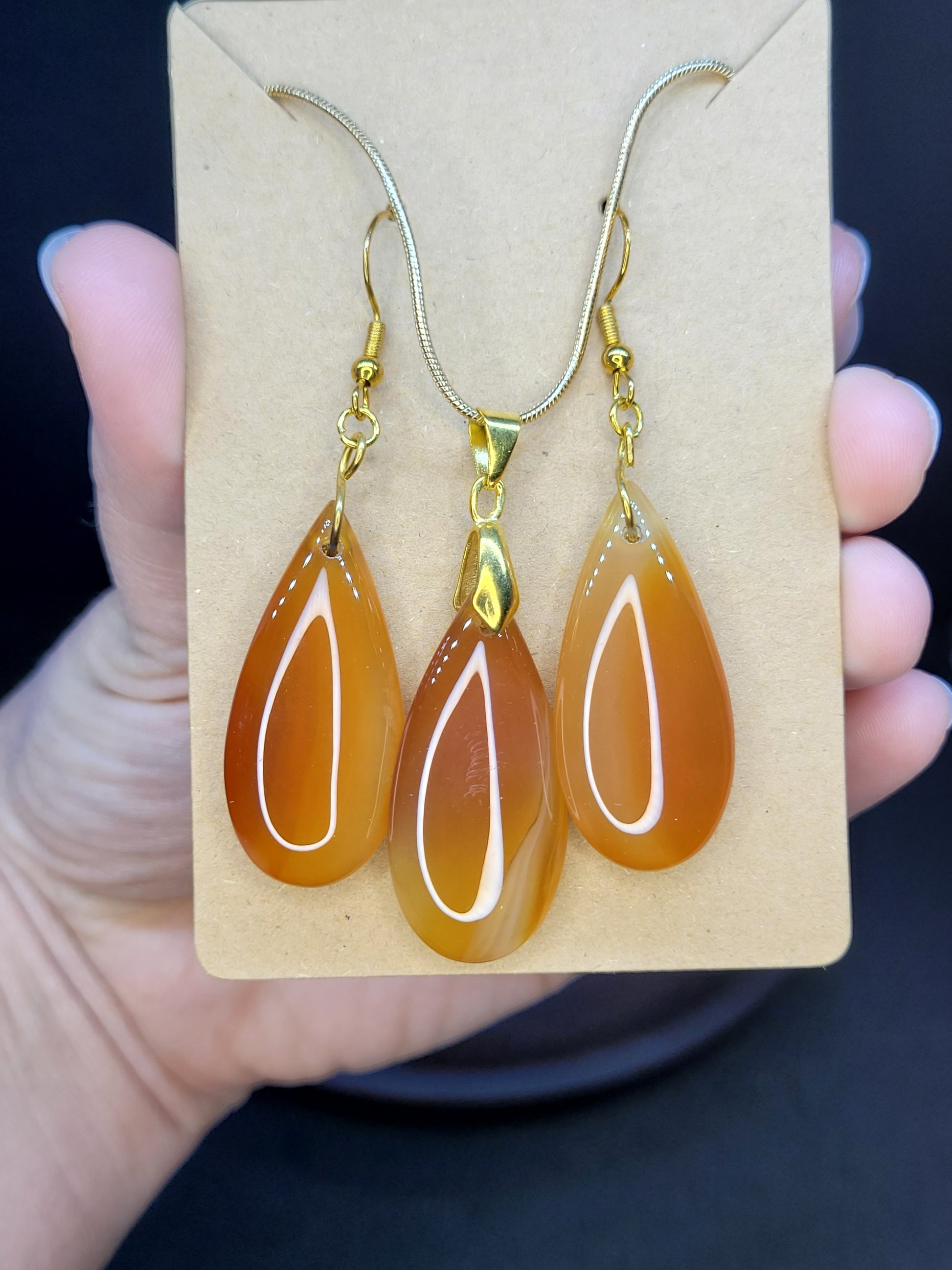 Discover the stunning, handmade Carnelian tear drop pendant earrings and necklace adorned in luxurious gold accents. This vibrant chalcedony variety is known for its grounding and energizing properties, believed to stimulate the Sacral Chakra for vitality, sexuality, and emotional balance. Boost your courage, confidence, and motivation with the help of Carnelian, as it encourages positive life choices and overcomes fear..