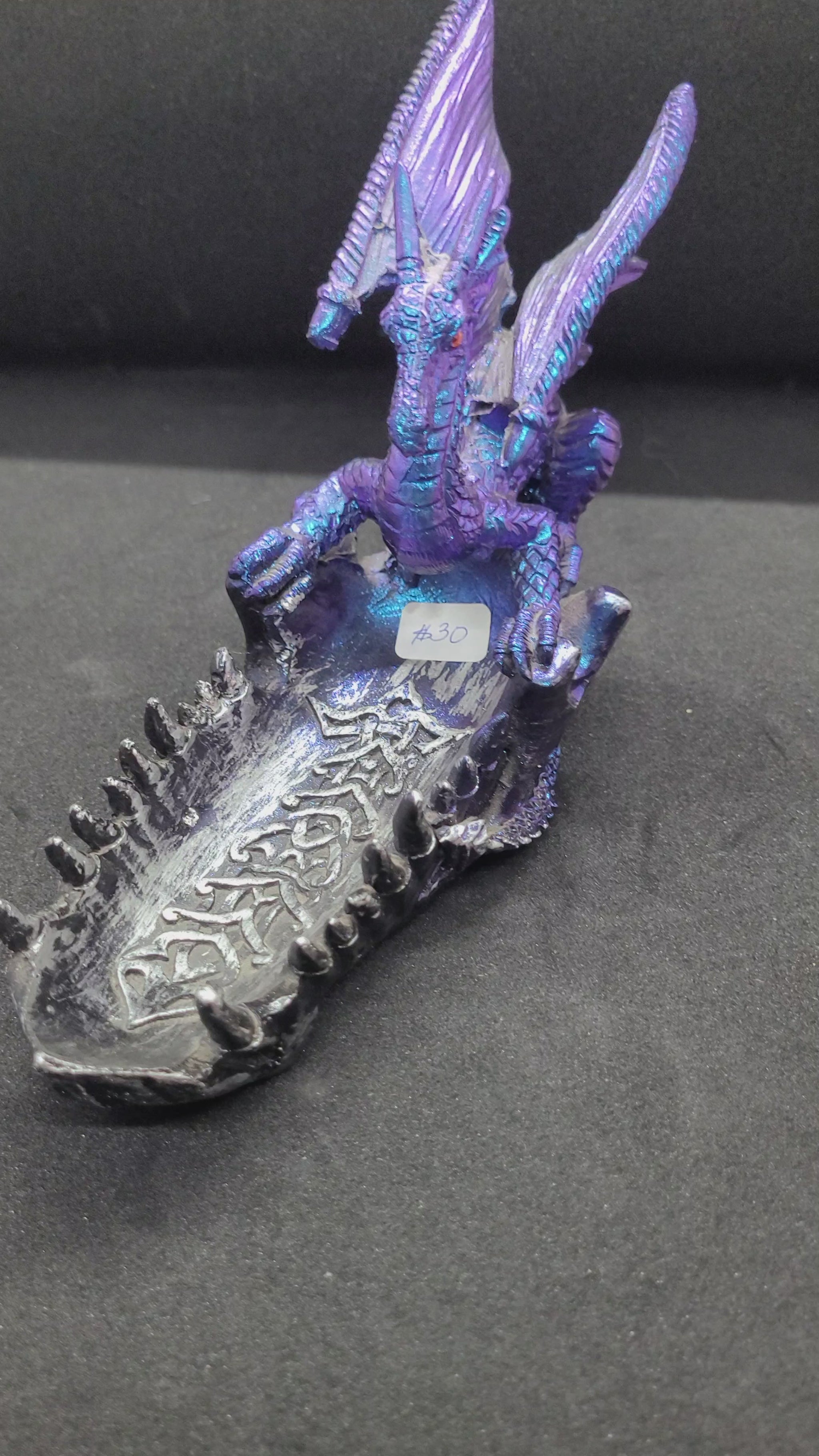 This dish features a blue/purple dragon perched on a silver dragon jaw, adorned with Celtic knot carvings and crafted from resilient resin.