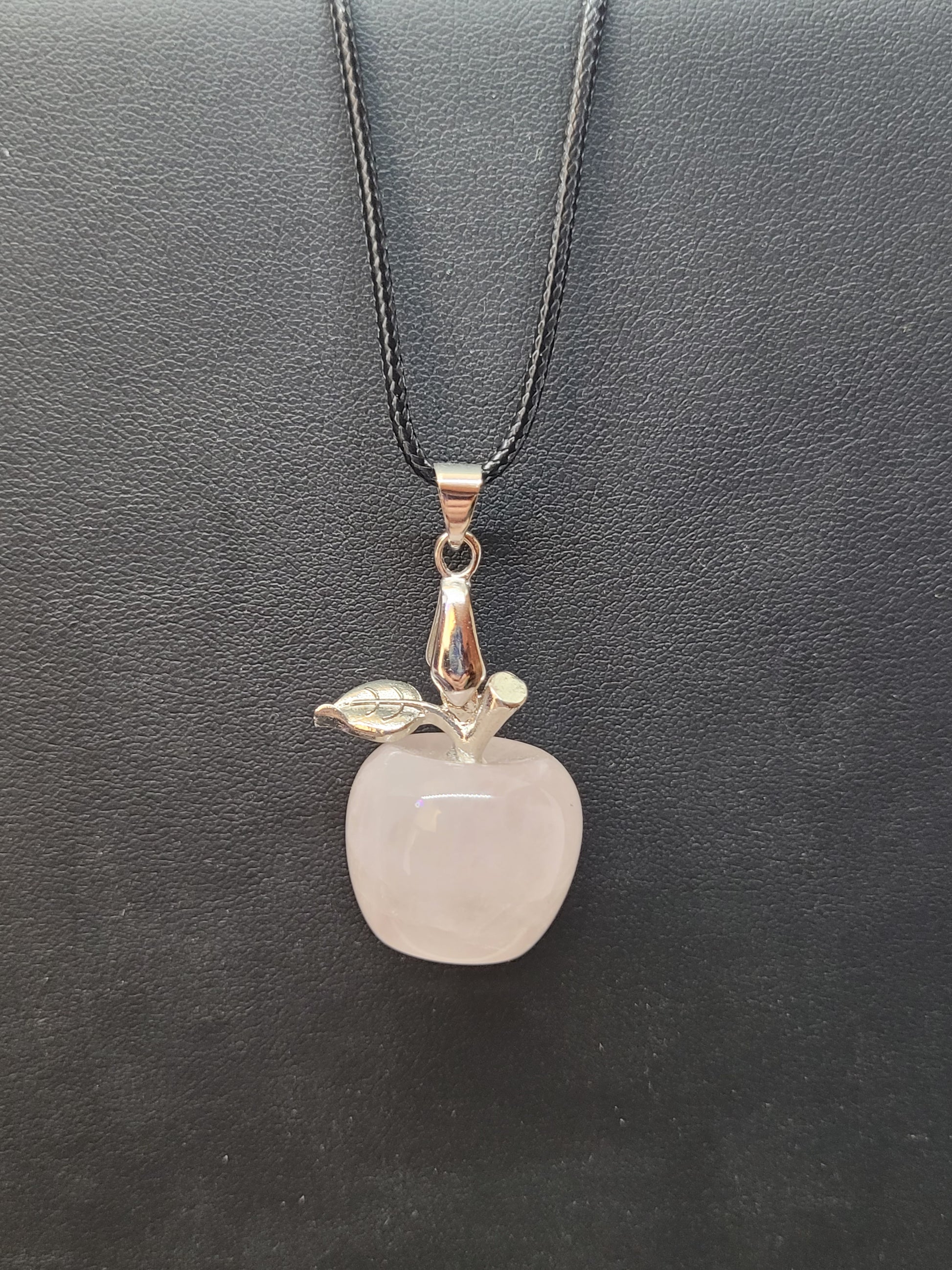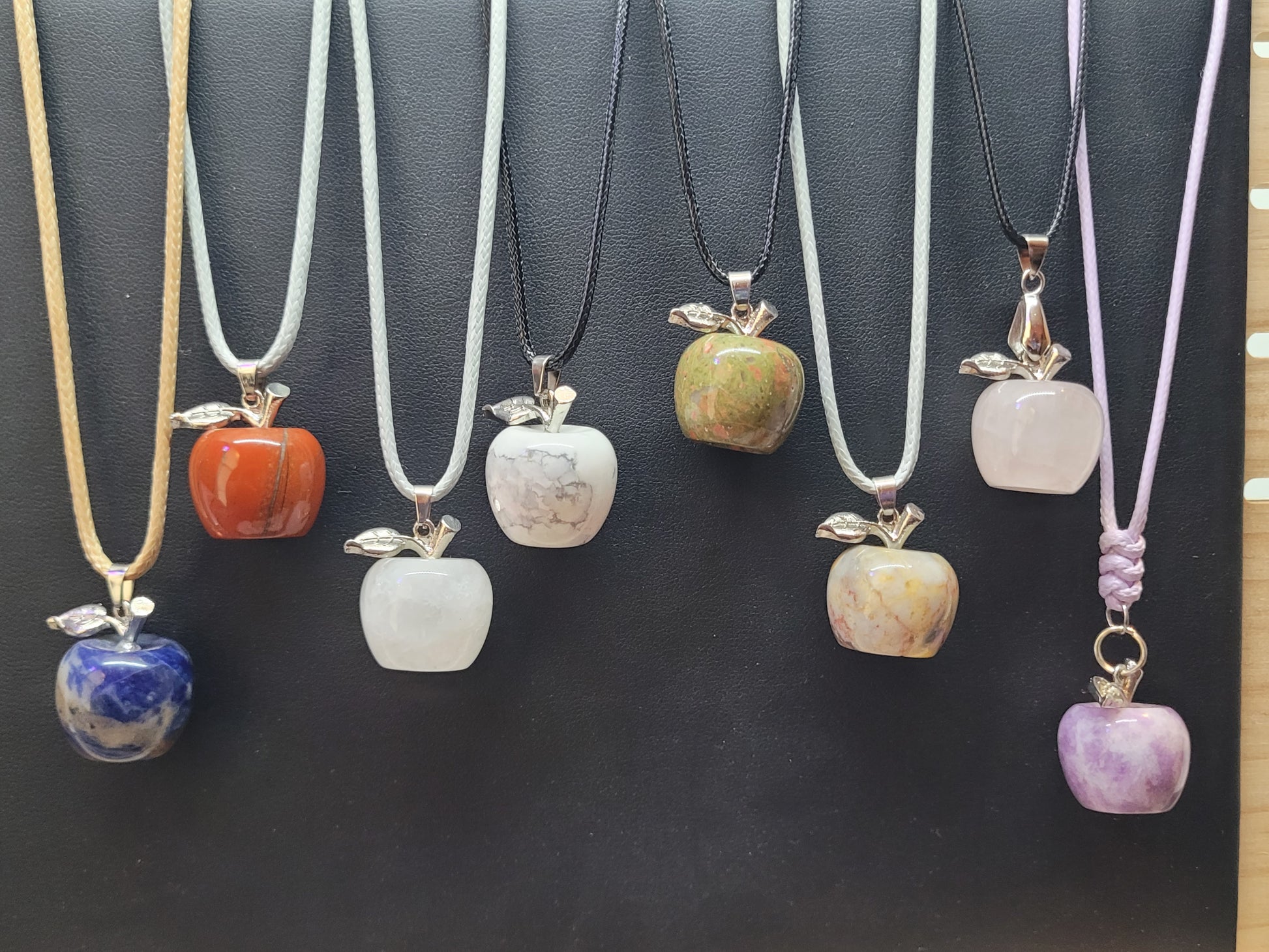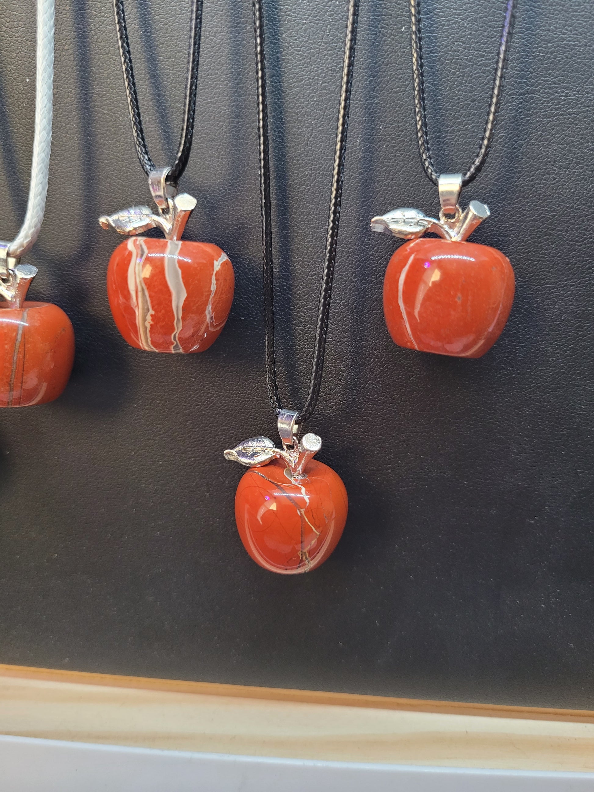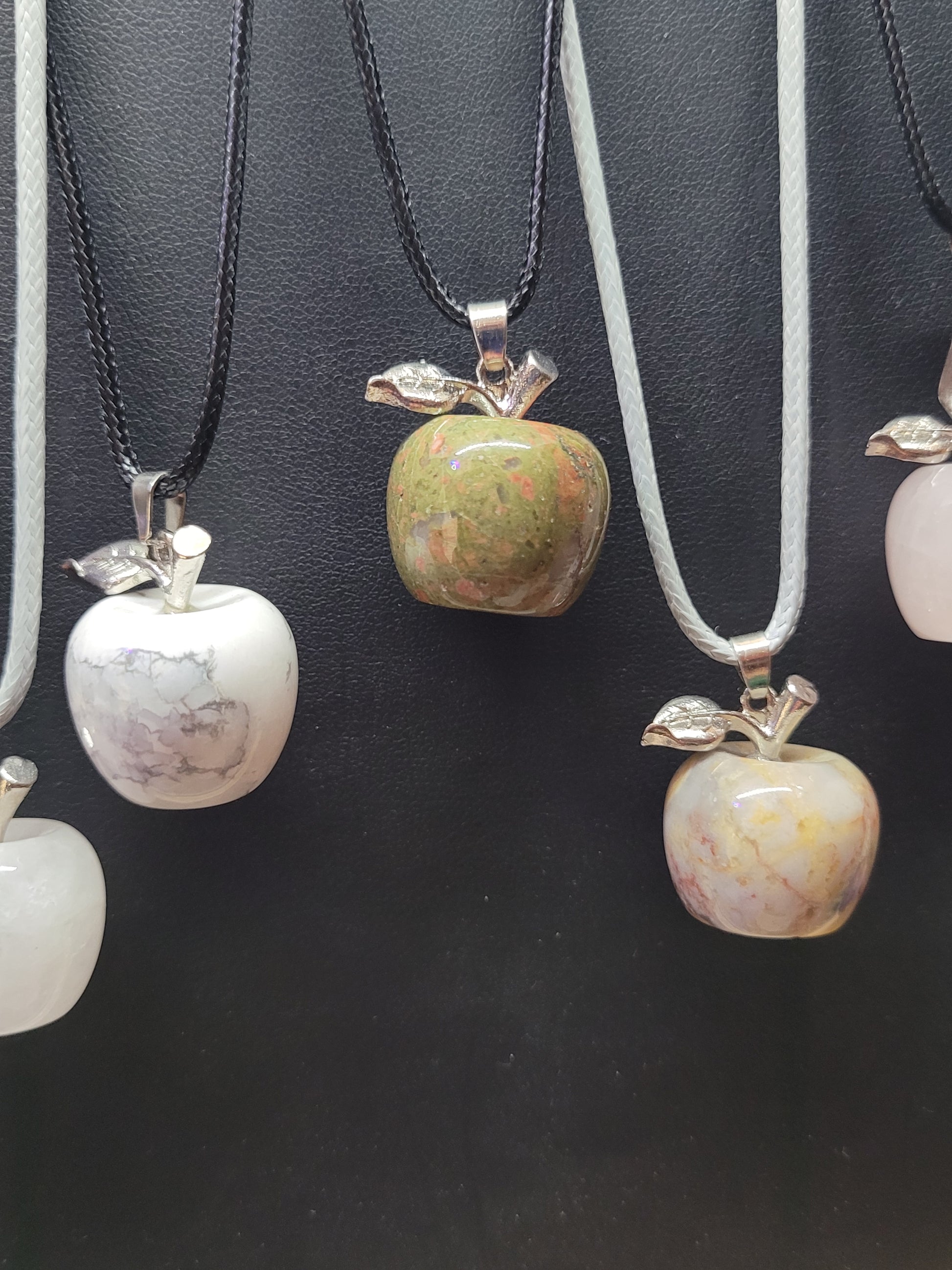 Crystal Apple Pendant Necklaces available in many materials : Rose Quartz, Red Jasper, Clear Quartz, Sodalite, Crazy Lace Agate, Howlite, TIger's Eye, & Unakite.
