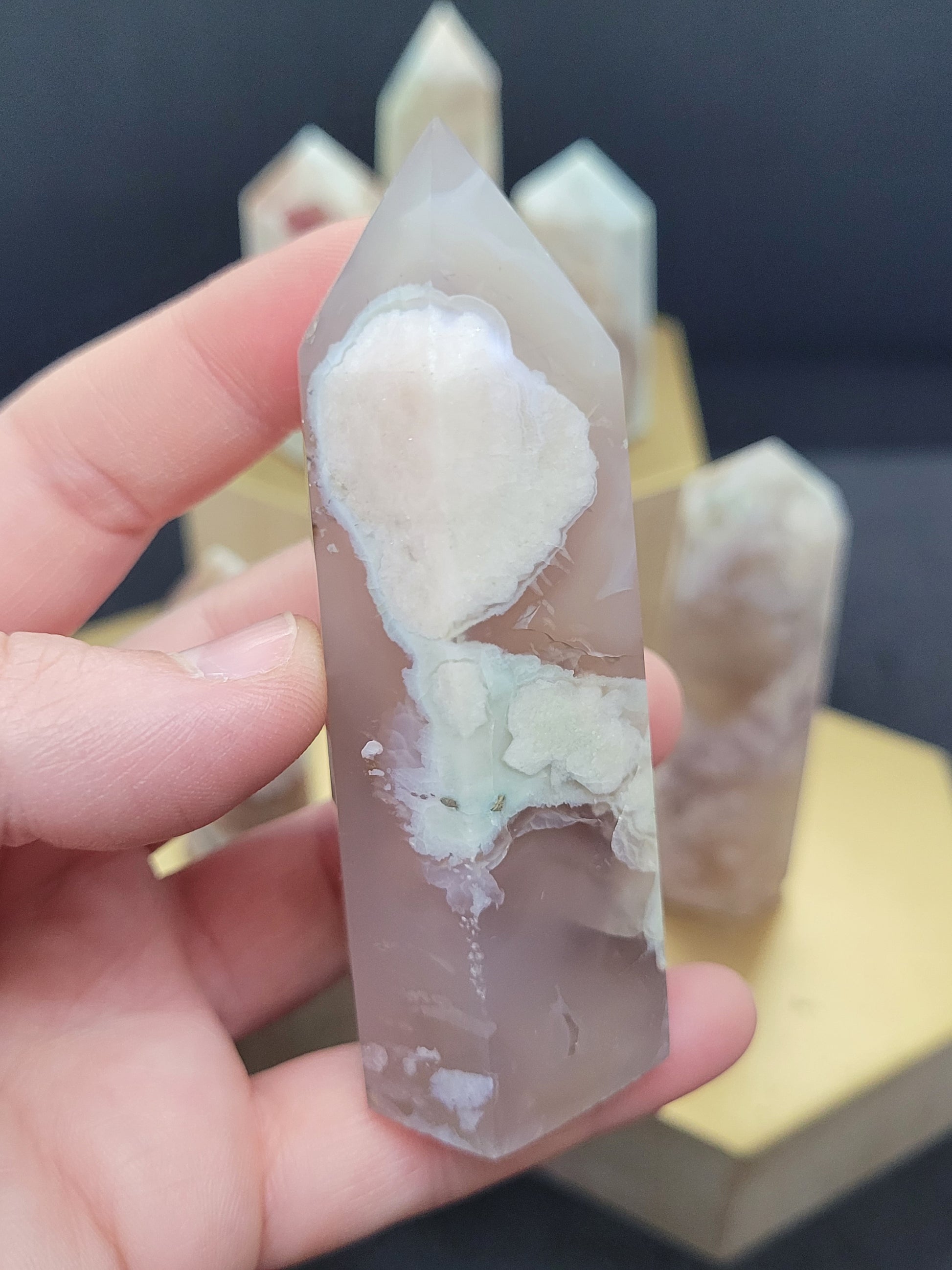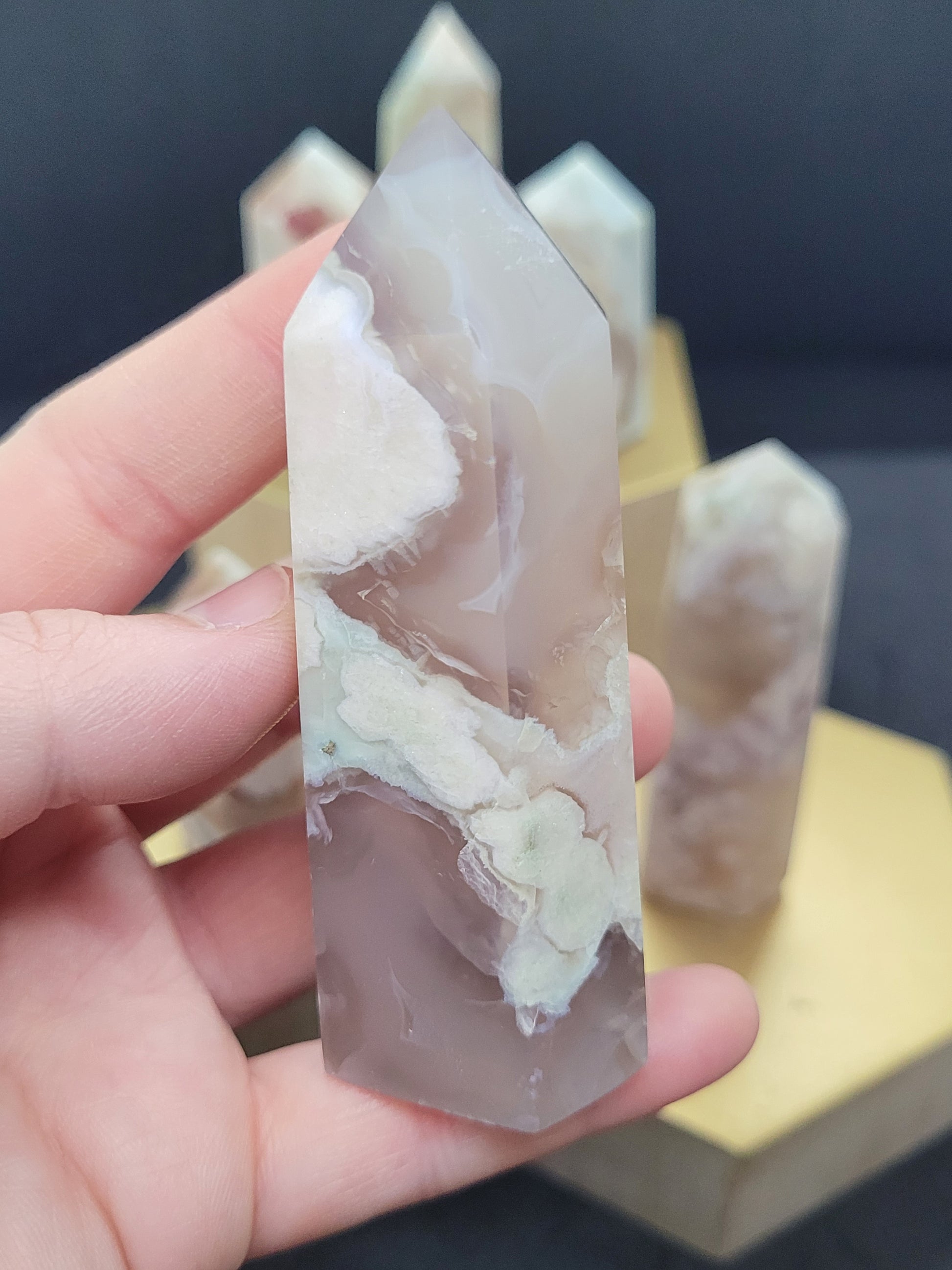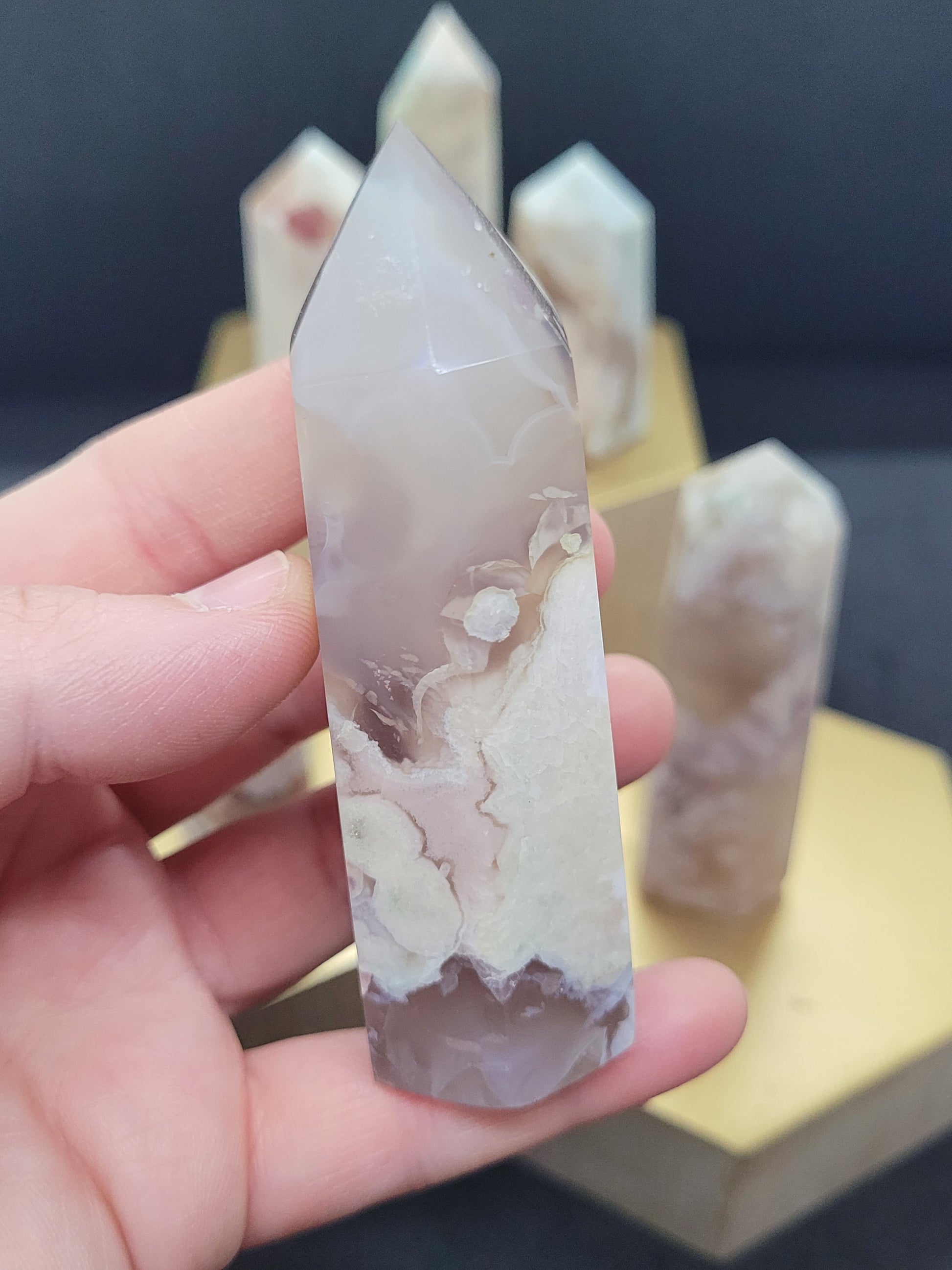 Beautiful darker hexagonal cut Flower Agate Towers with stunning cherry, blue, and green flower agate inclusions. This unique stone is thought to spark new beginnings and promote personal growth. It is also believed to foster a positive outlook and graceful acceptance of change. Flower agate is known for restoring emotional equilibrium and releasing negative energies, while channeling the divine feminine energy of connecting emotions and reality.