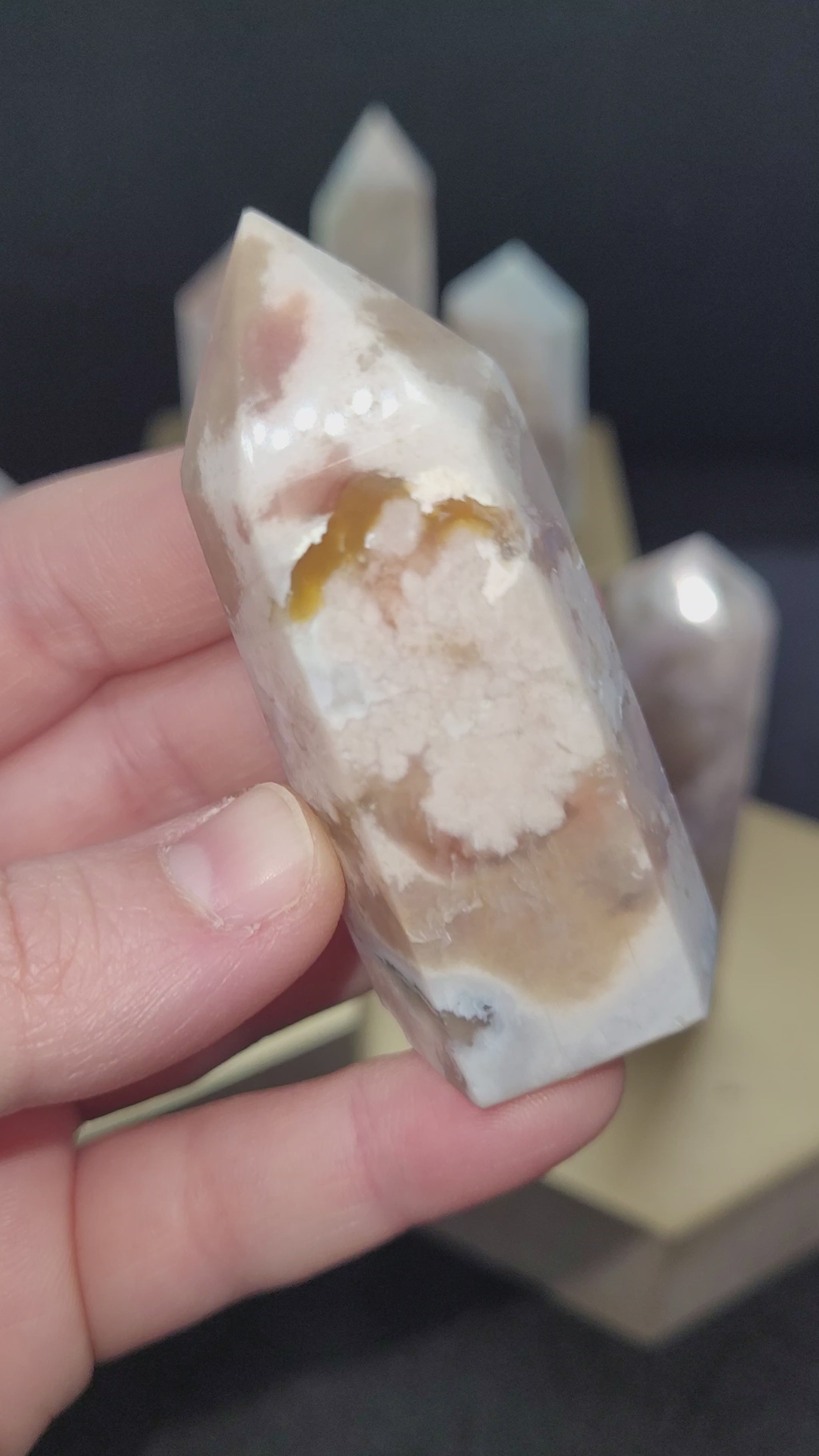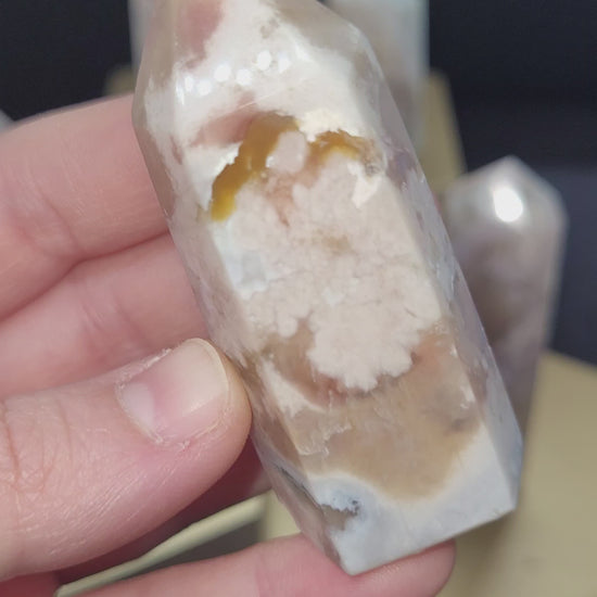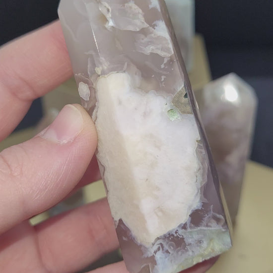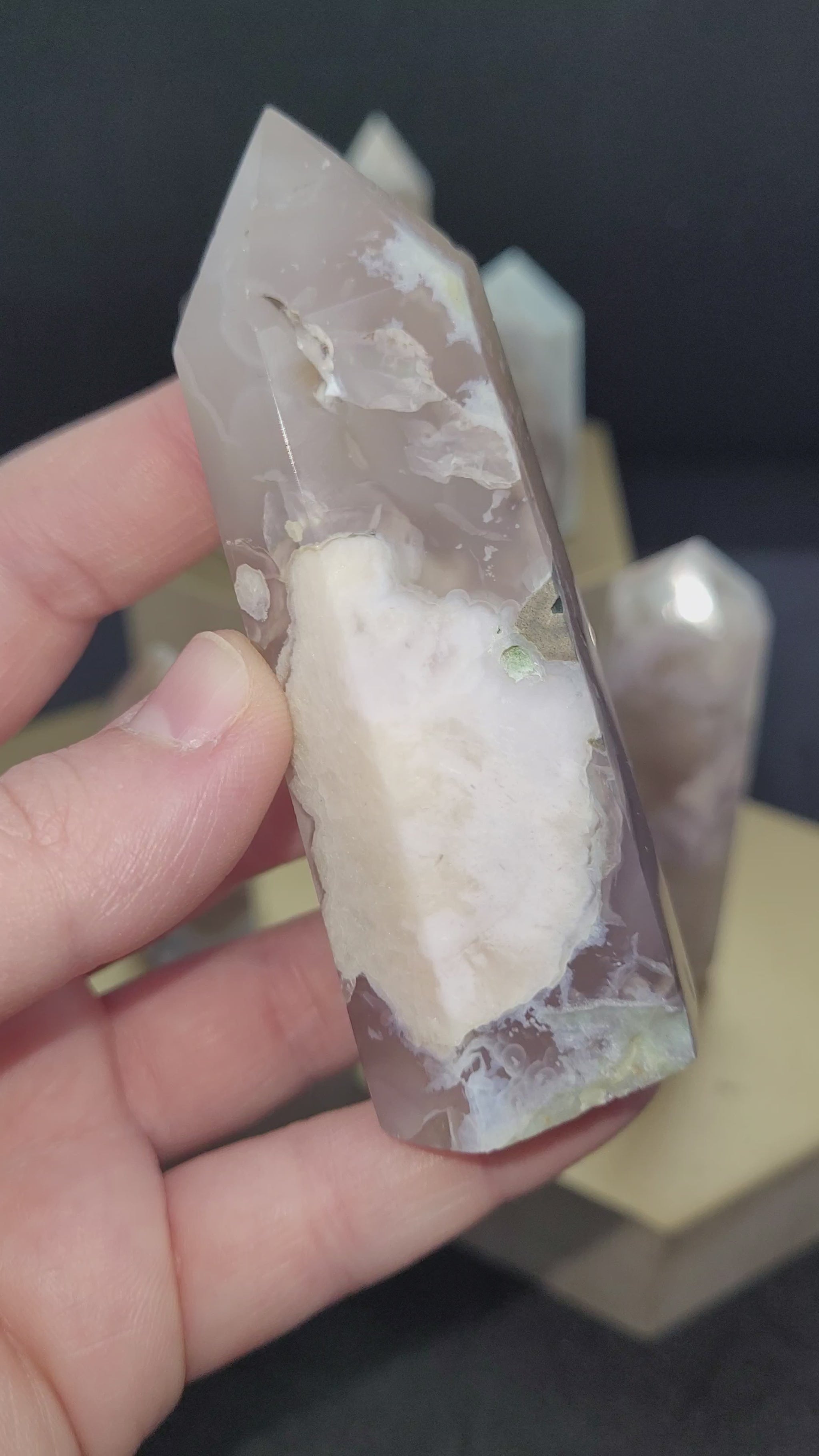 Beautiful darker hexagonal cut Flower Agate Towers with stunning cherry, blue, and green flower agate inclusions. This unique stone is thought to spark new beginnings and promote personal growth. It is also believed to foster a positive outlook and graceful acceptance of change. Flower agate is known for restoring emotional equilibrium and releasing negative energies, while channeling the divine feminine energy of connecting emotions and reality.