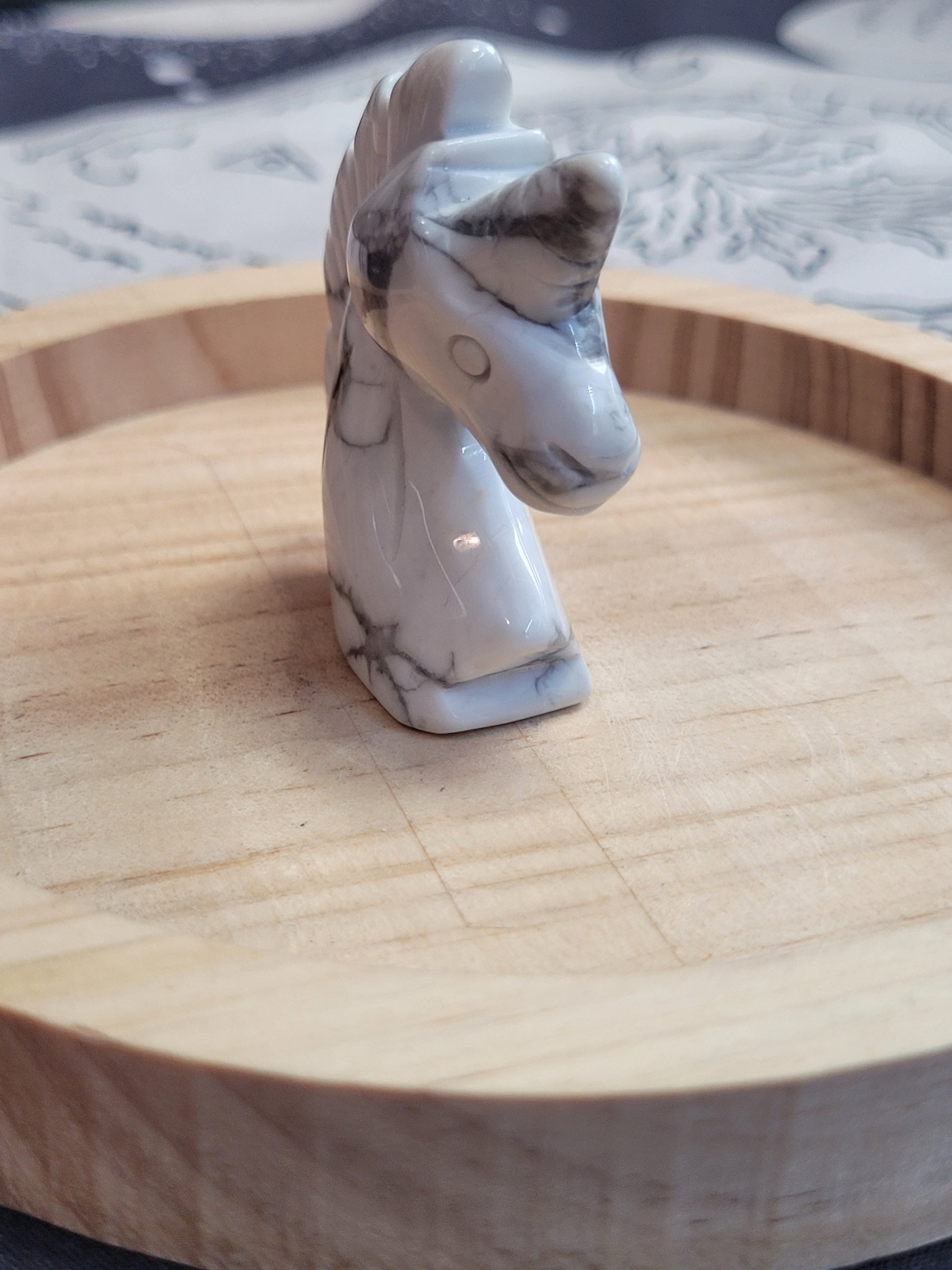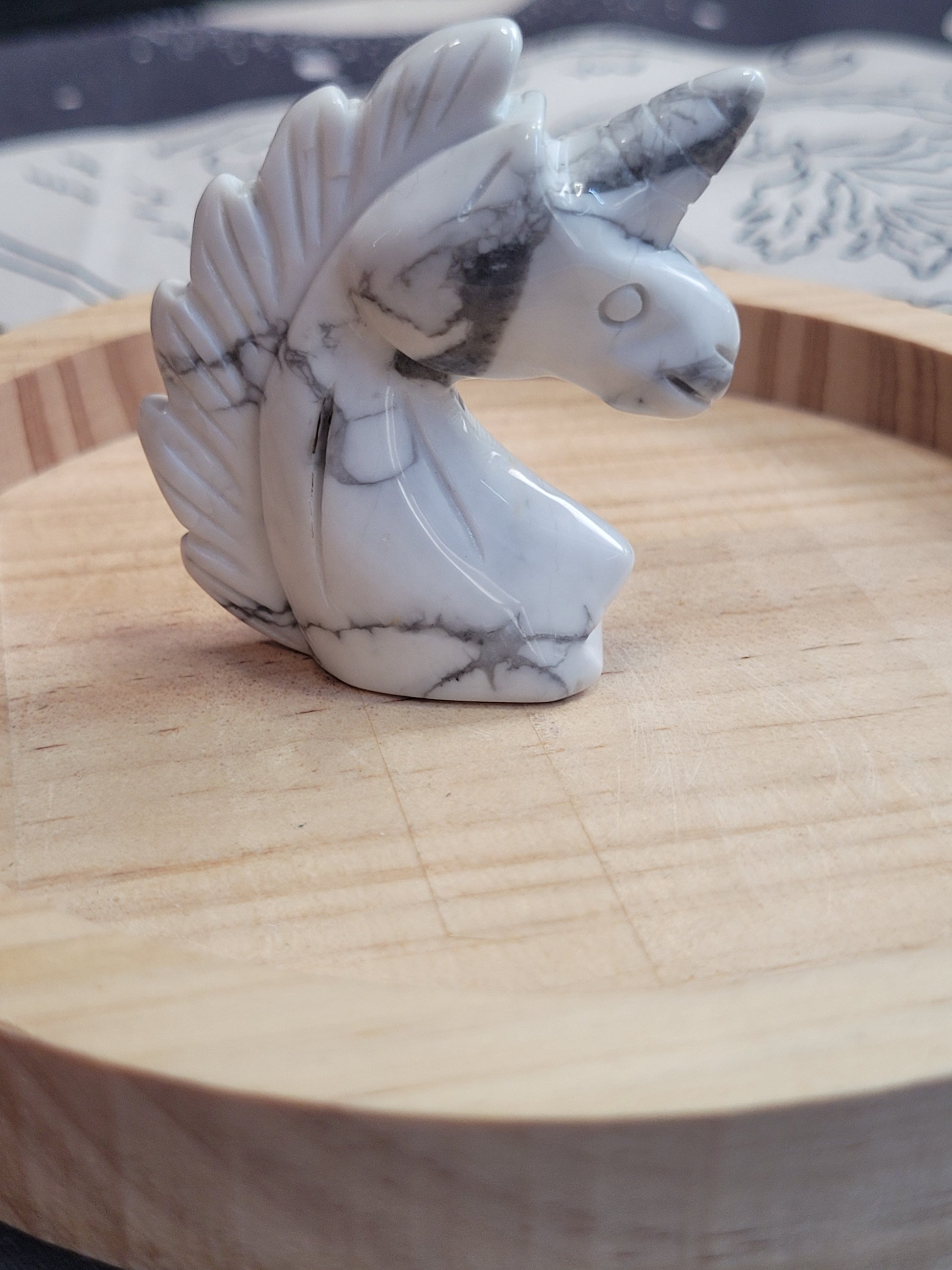 Discover the serene beauty of this Howlite unicorn bust carving, a piece that merges aesthetic charm with purposeful crystal energy. Howlite is renowned for its grounding influence, supporting emotional equilibrium and mental serenity while dissolving stress and anxiety. Through its crown chakra alignment, this stone deepens spiritual consciousness and intuitive awareness, while simultaneously enhancing patience, dialogue, and imaginative expression. The unicorn form itself embodies symbolism of purity, enchantment, and restorative healing—qualities that resonate powerfully with howlite's inherent vibrations. Perfect for those seeking to cultivate inner transformation, spark creative inspiration, and nurture a deeper connection to their spiritual path, this carving serves as both a meaningful talisman and an inspiring decorative presence.