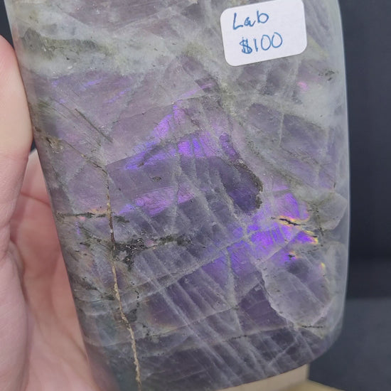 This large purple labradorite freeform weighs 2lbs 7.4oz and stands at 5.4in tall, featuring an incredible purple/pink flash. Well known as the "stone of transformation," labradorite is said to assist individuals in navigating through periods of change, providing strength and resilience. It is also believed to act as a protective shield, keeping the aura clear and balanced by warding off negative energies. Highly regarded in the metaphysical world, labradorite is considered one of the most powerful protectors, supporting the body and spirit in self-healing while shielding the aura from the world's negativity.