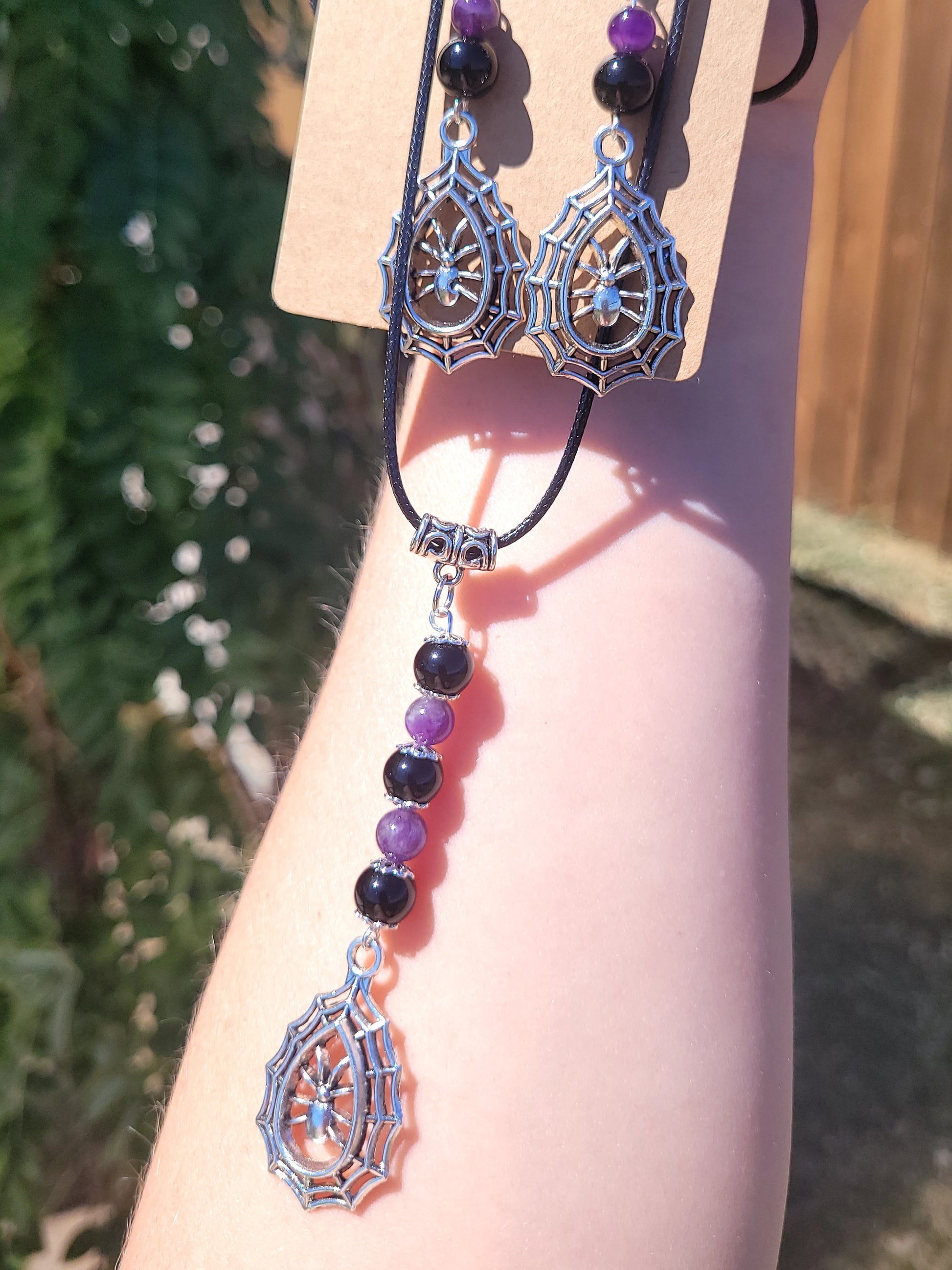 Obsidian/Amethyst 8mm bead Spider charm Necklace/ Earrings set - Handmade