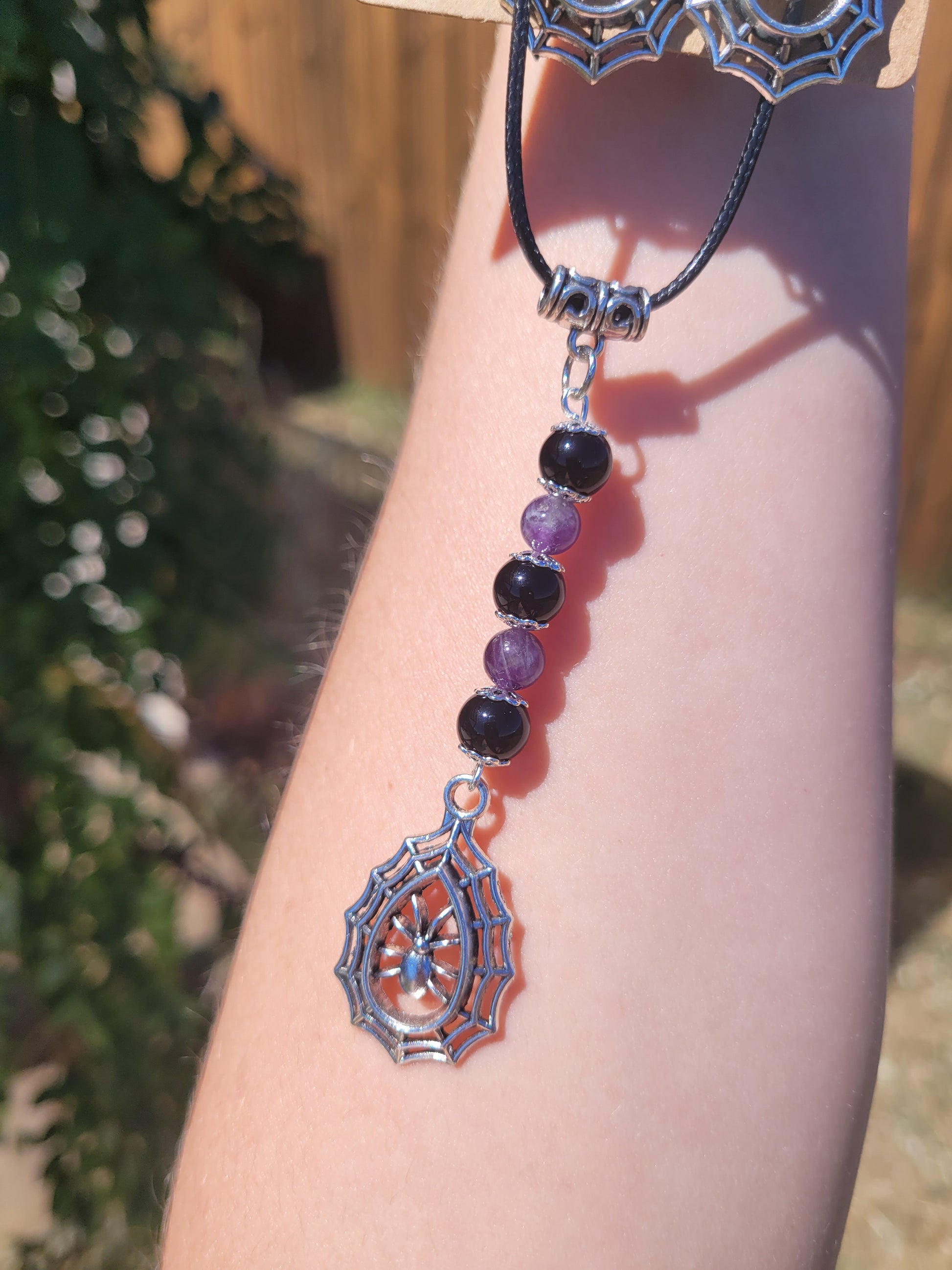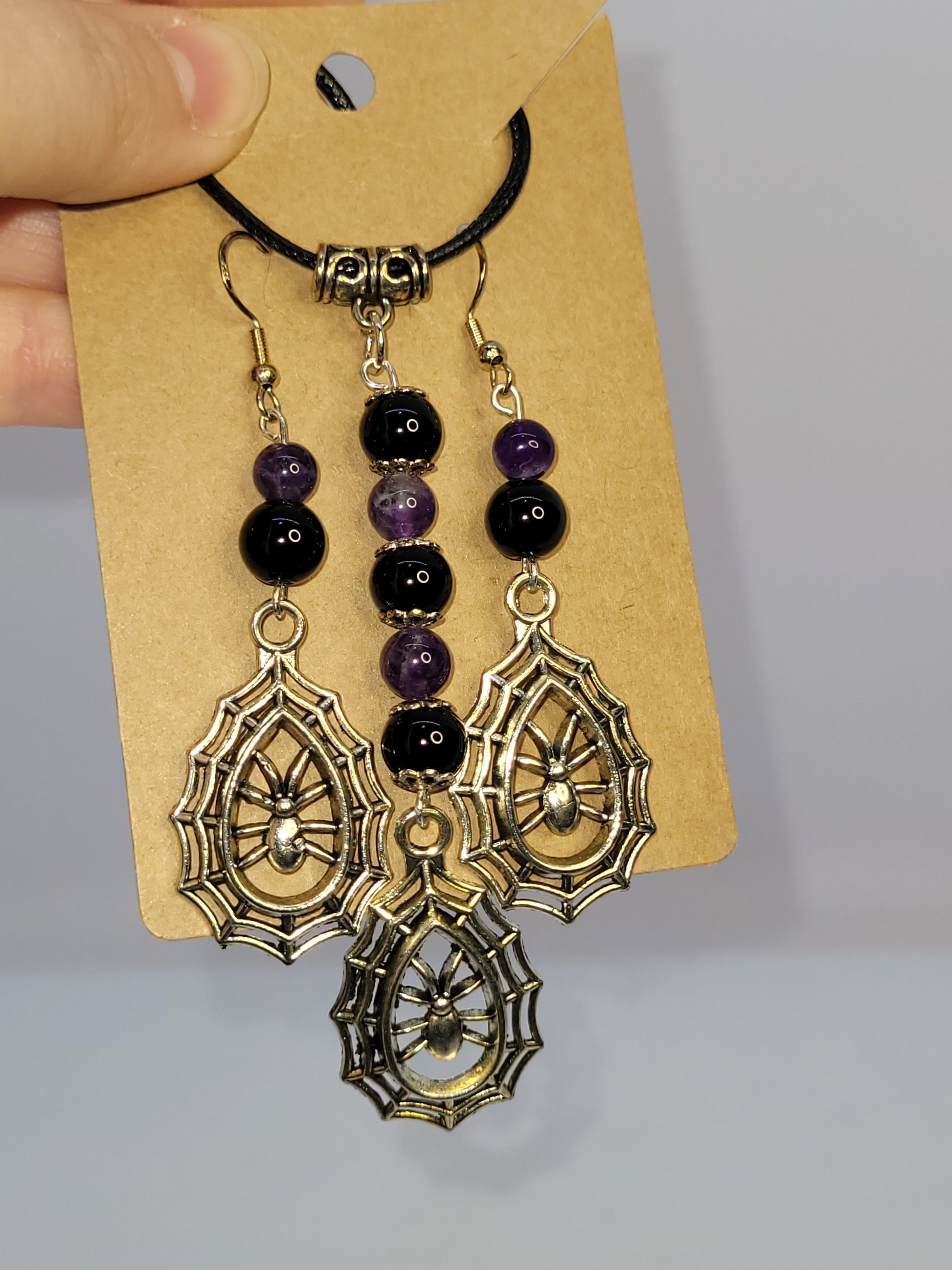Experience the elegance of our Obsidian/Amethyst 8mm bead Spider charm Necklace/Earrings set featuring intricate spider web charms. Made with high-quality 8mm amethyst and obsidian beads, this set is a must-have for any jewelry collection.