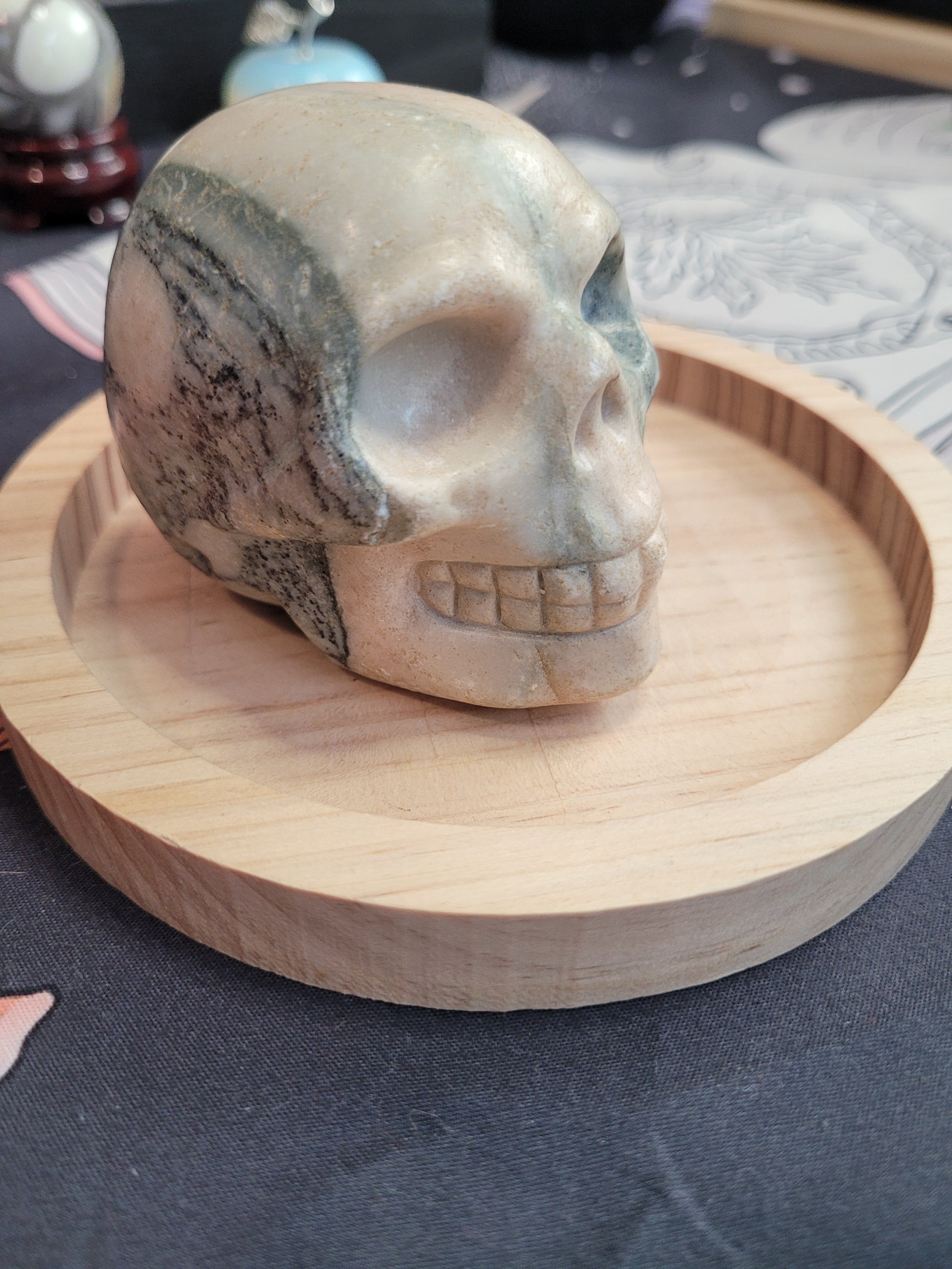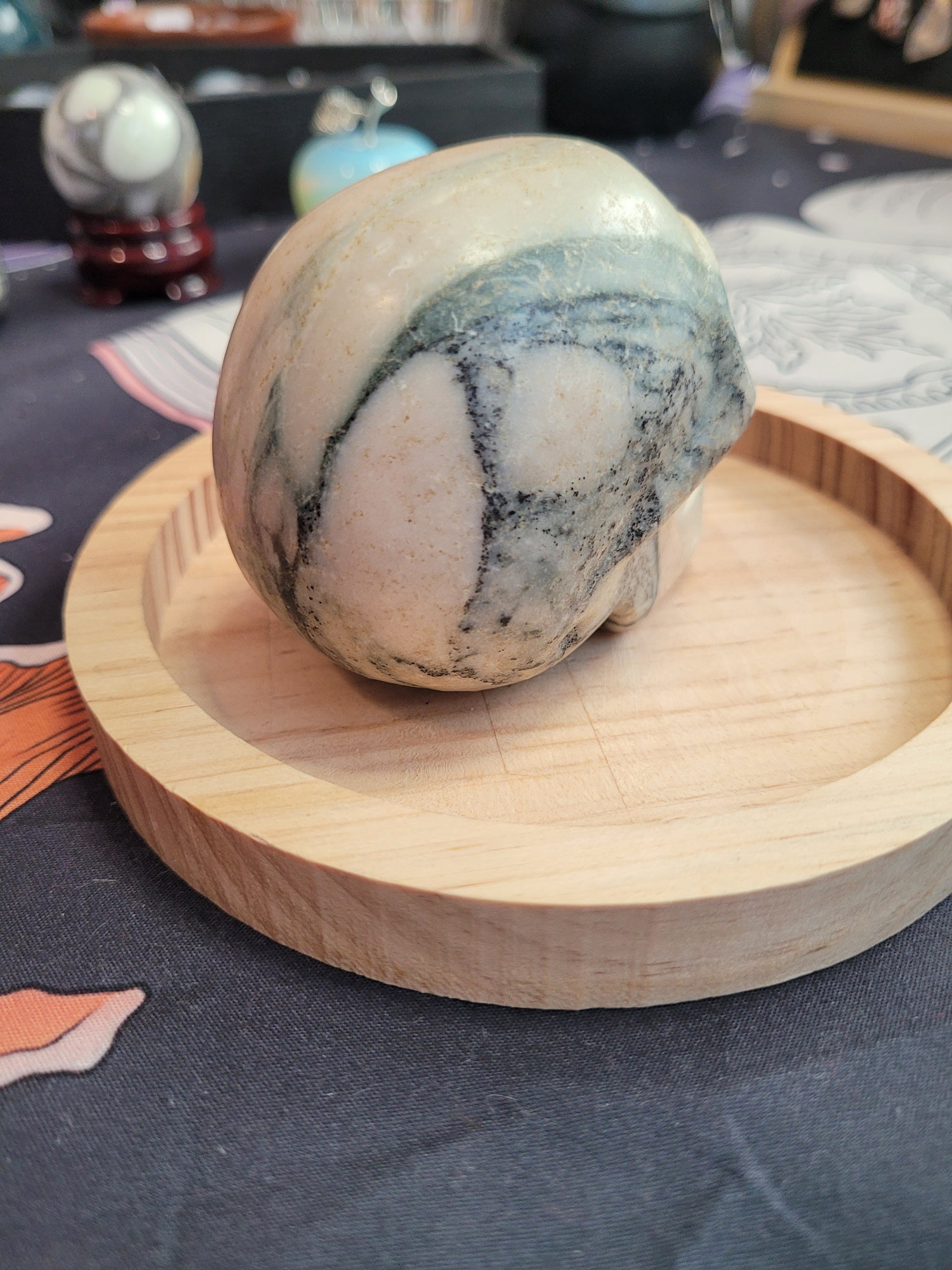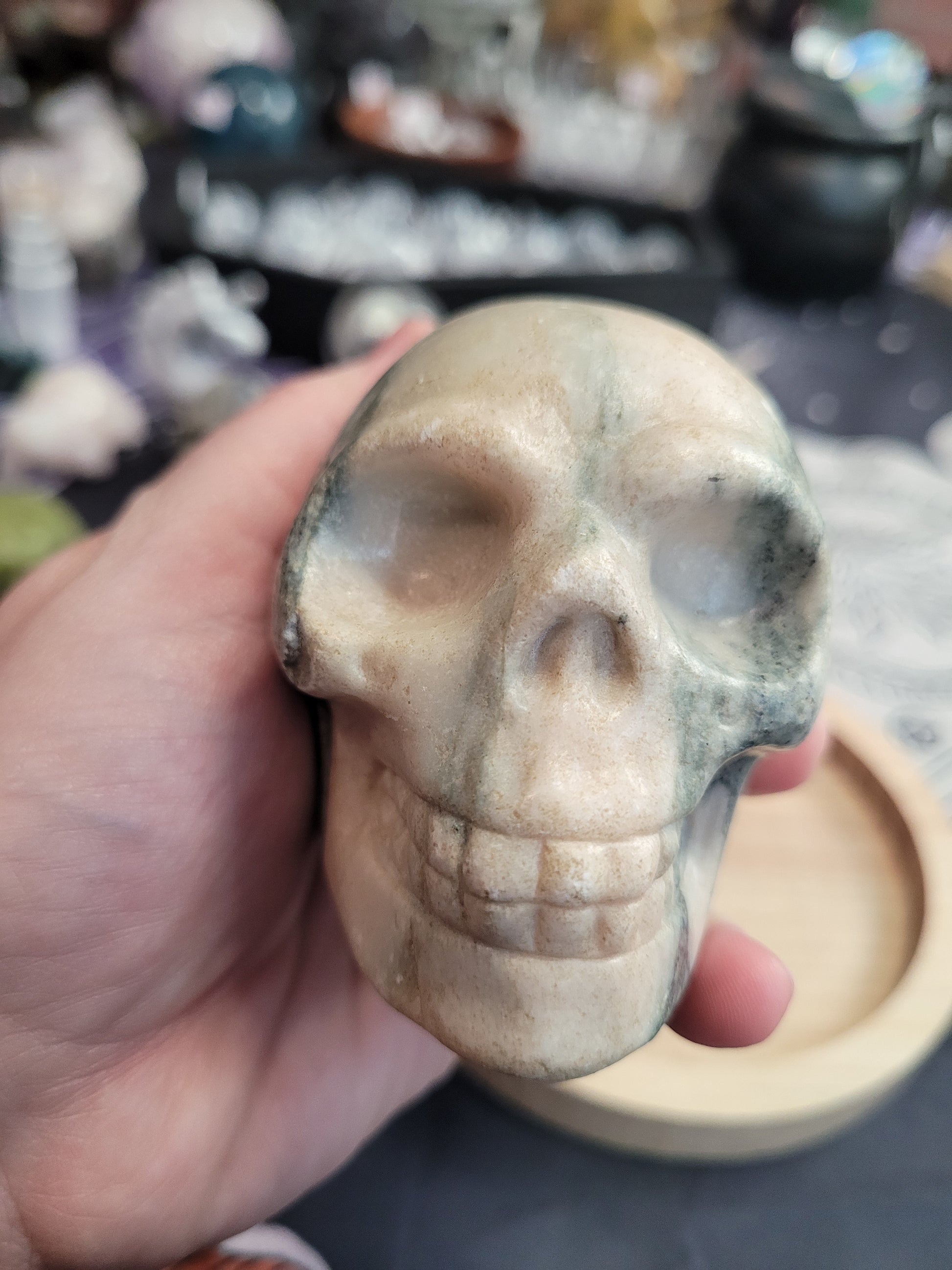 This substantial Pink Zebra Jasper skull carving delivers both aesthetic appeal and spiritual significance. As a misfit piece, it's offered at an exceptional value while retaining all the energetic qualities of flawless specimens. The stone's grounding properties are believed to cultivate emotional resilience, deepen compassion, and spark creative inspiration while fostering a sense of stability and protection. Crystal skull carvings have long been revered in spiritual traditions as conduits for transformation and wisdom, serving as focal points for meditation, energy work, and personal development. Whether displayed on an altar, meditation space, or home sanctuary, this piece functions as both a striking decorative element and a meaningful tool for those seeking to enhance their spiritual practice and energetic well-being.