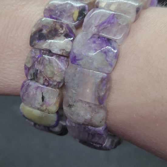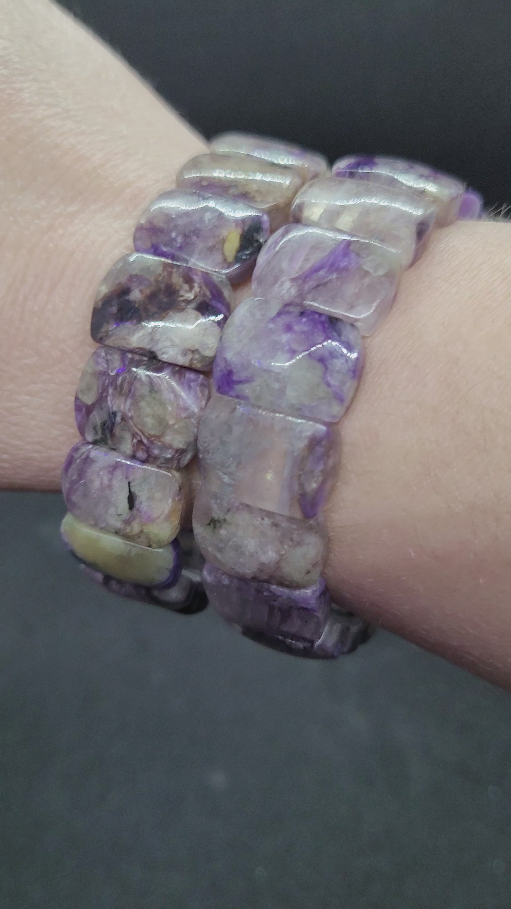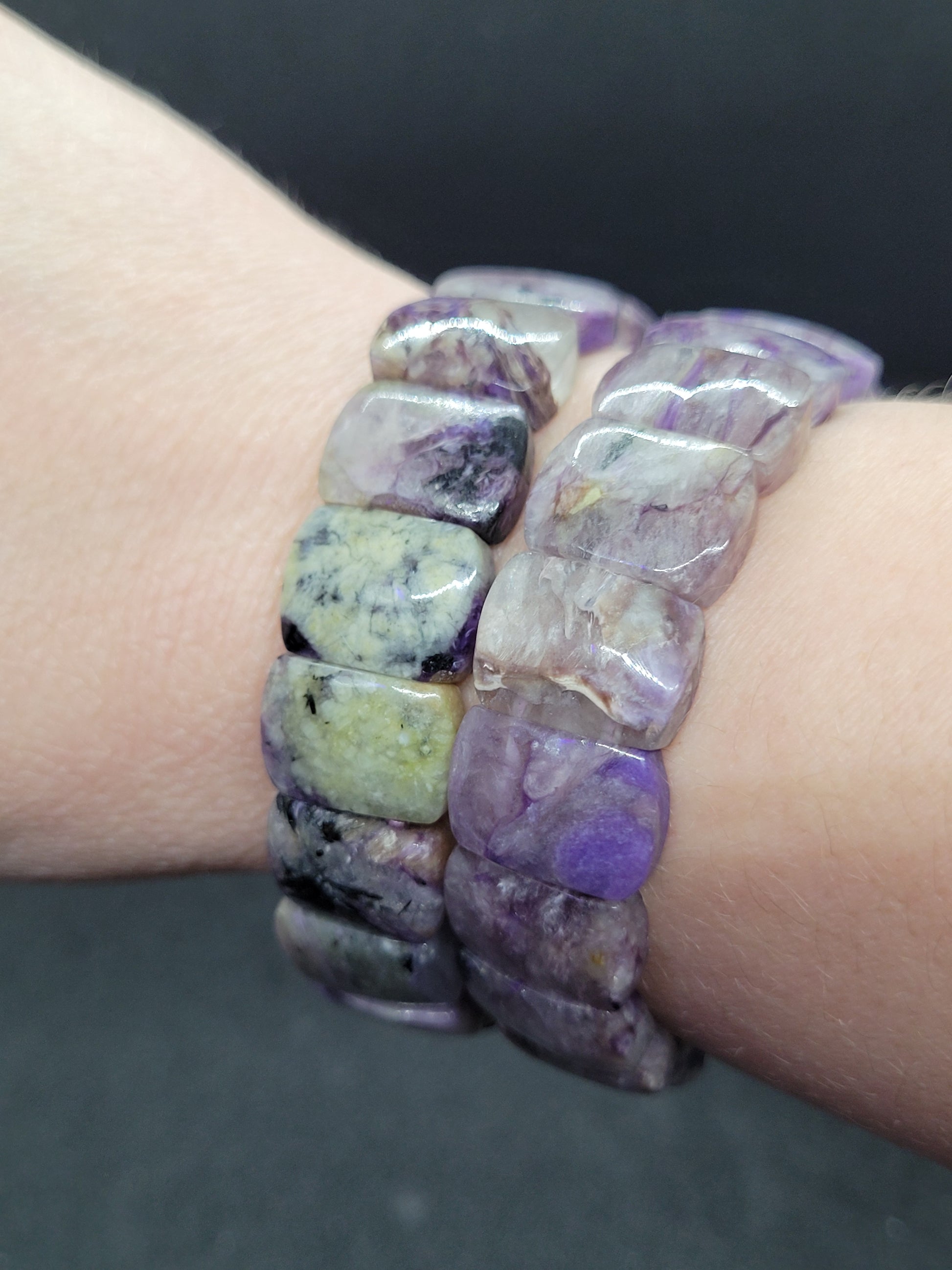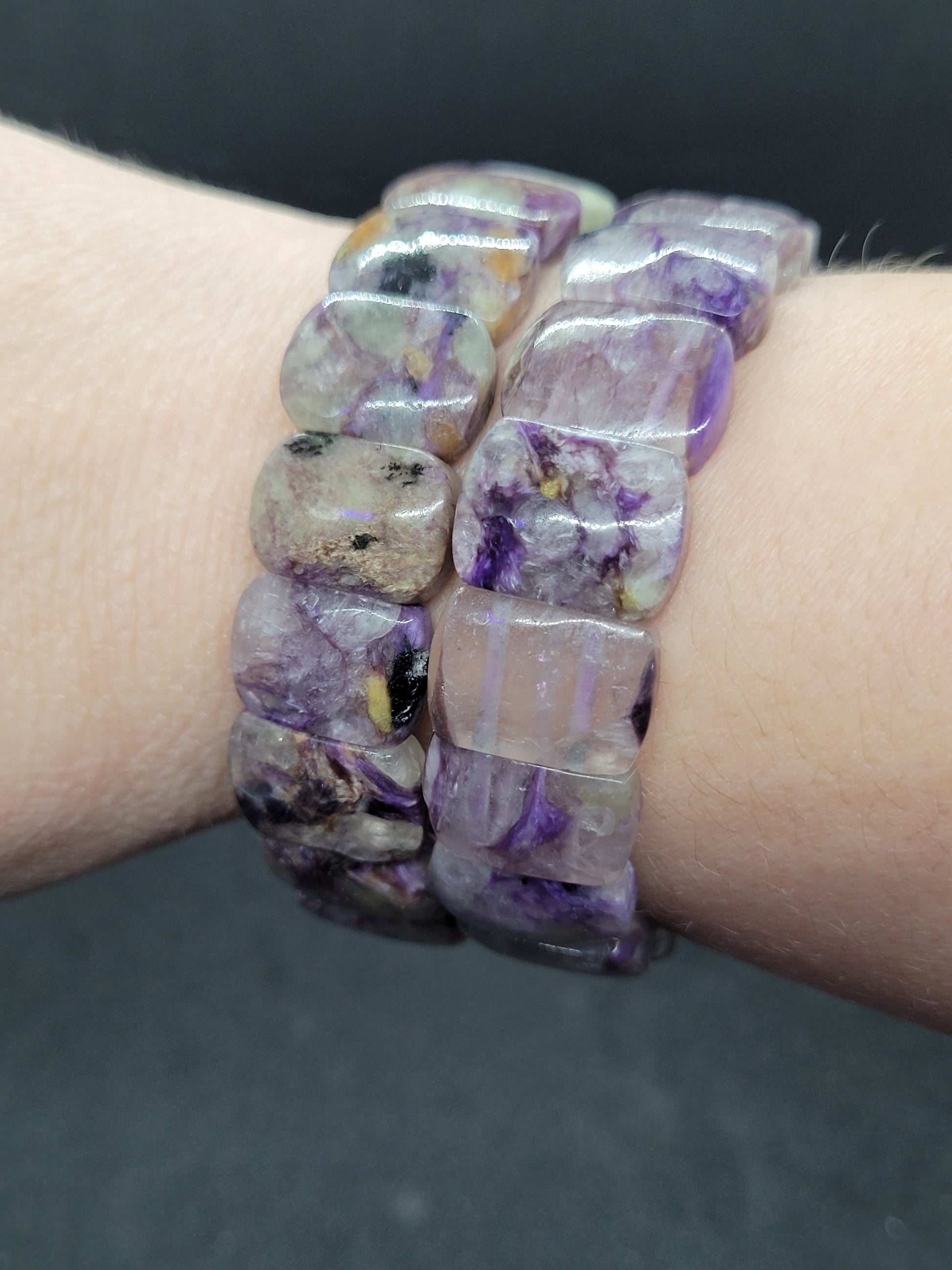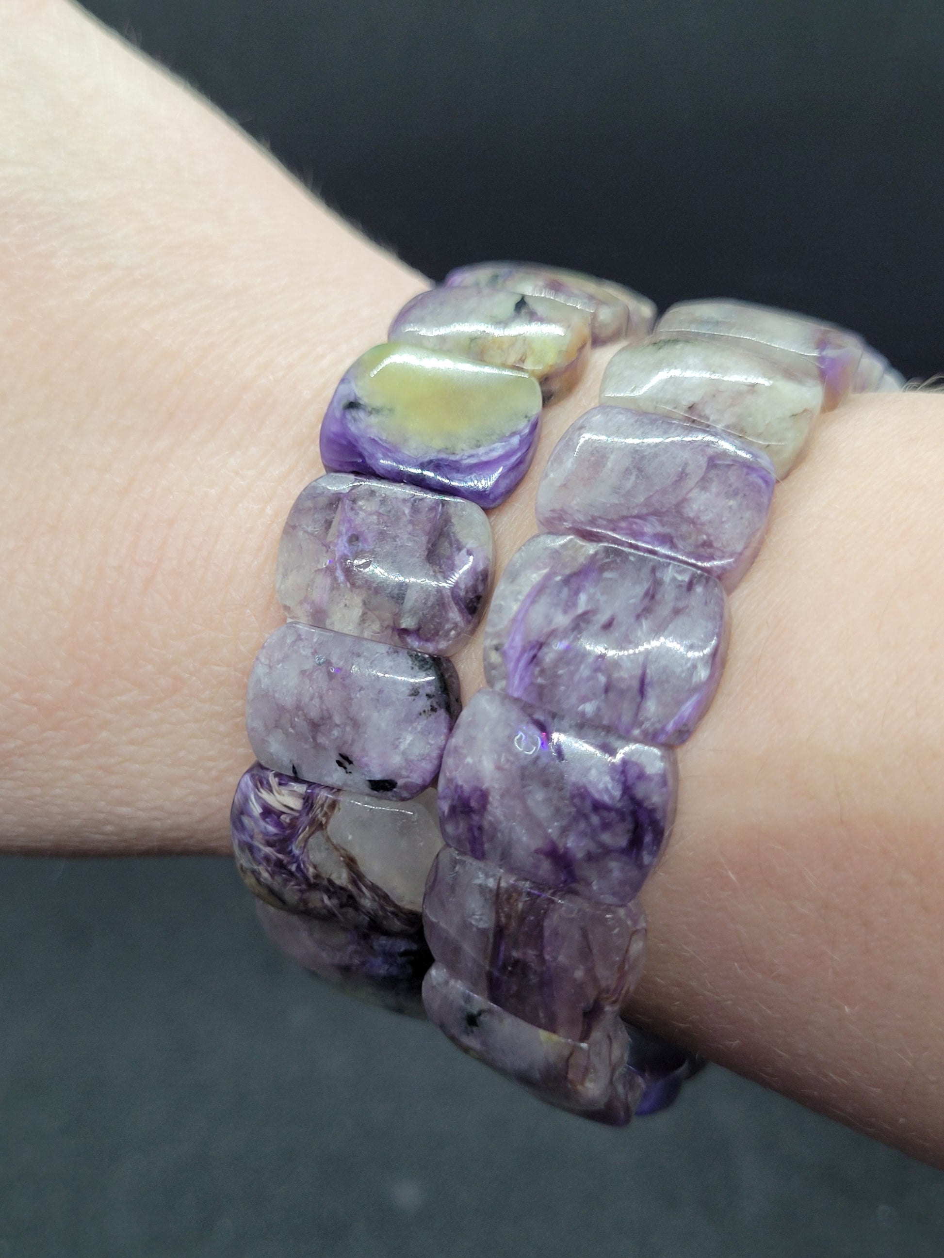 Rectangle Charoite Bangles feature meticulously cut beads of this rare transformation stone. Charoite enhances intuition and creativity while fostering spiritual growth and inner strength. This powerful crystal facilitates positive change, deepens wisdom, and creates pathways for spiritual guidance. Known for its chakra-opening properties, particularly the third eye and crown, Charoite assists in emotional healing by releasing negative patterns and balancing the aura. These bangles serve as tools for personal transformation, helping wearers overcome challenges and recognize new possibilities in familiar situations.