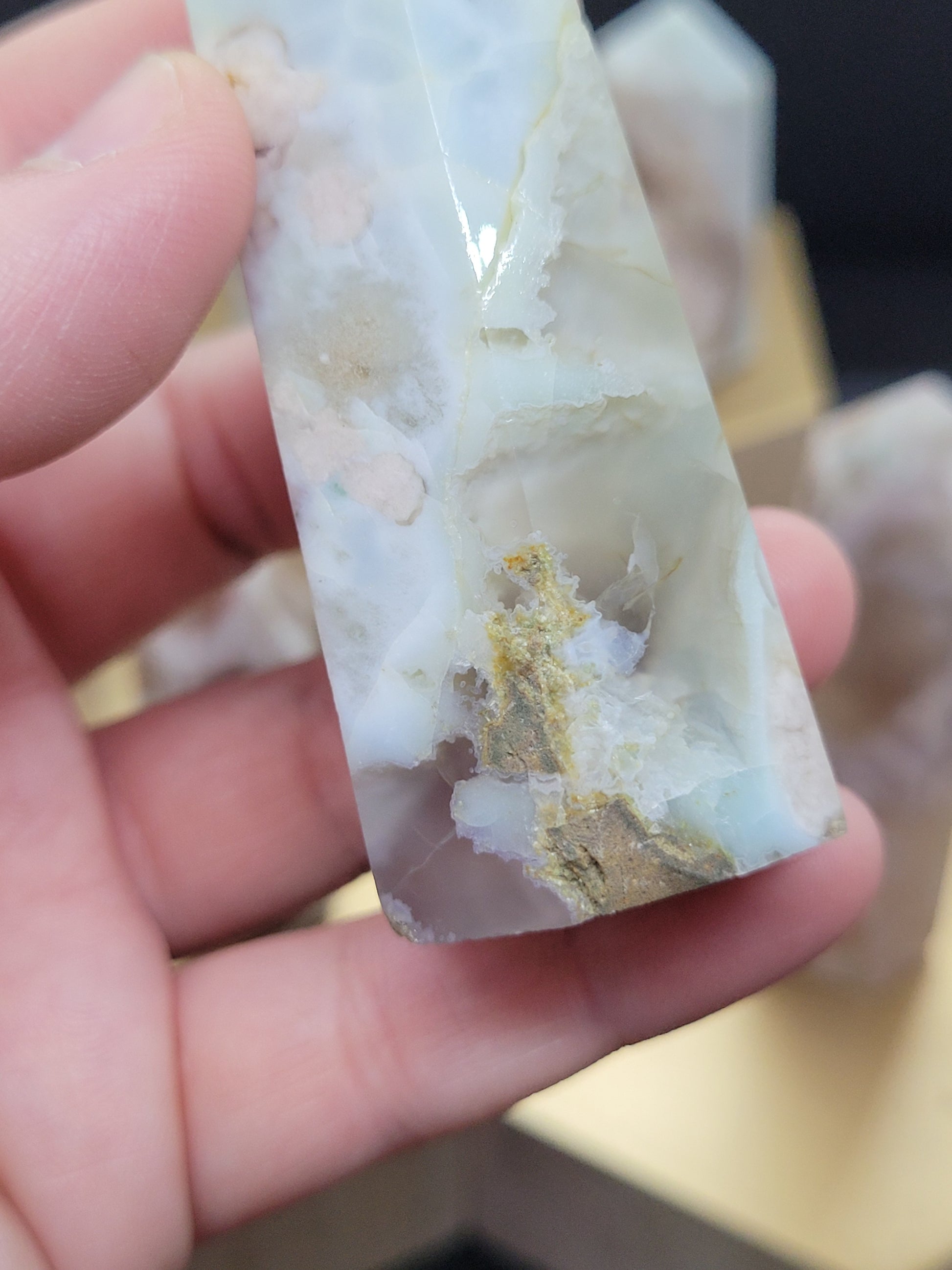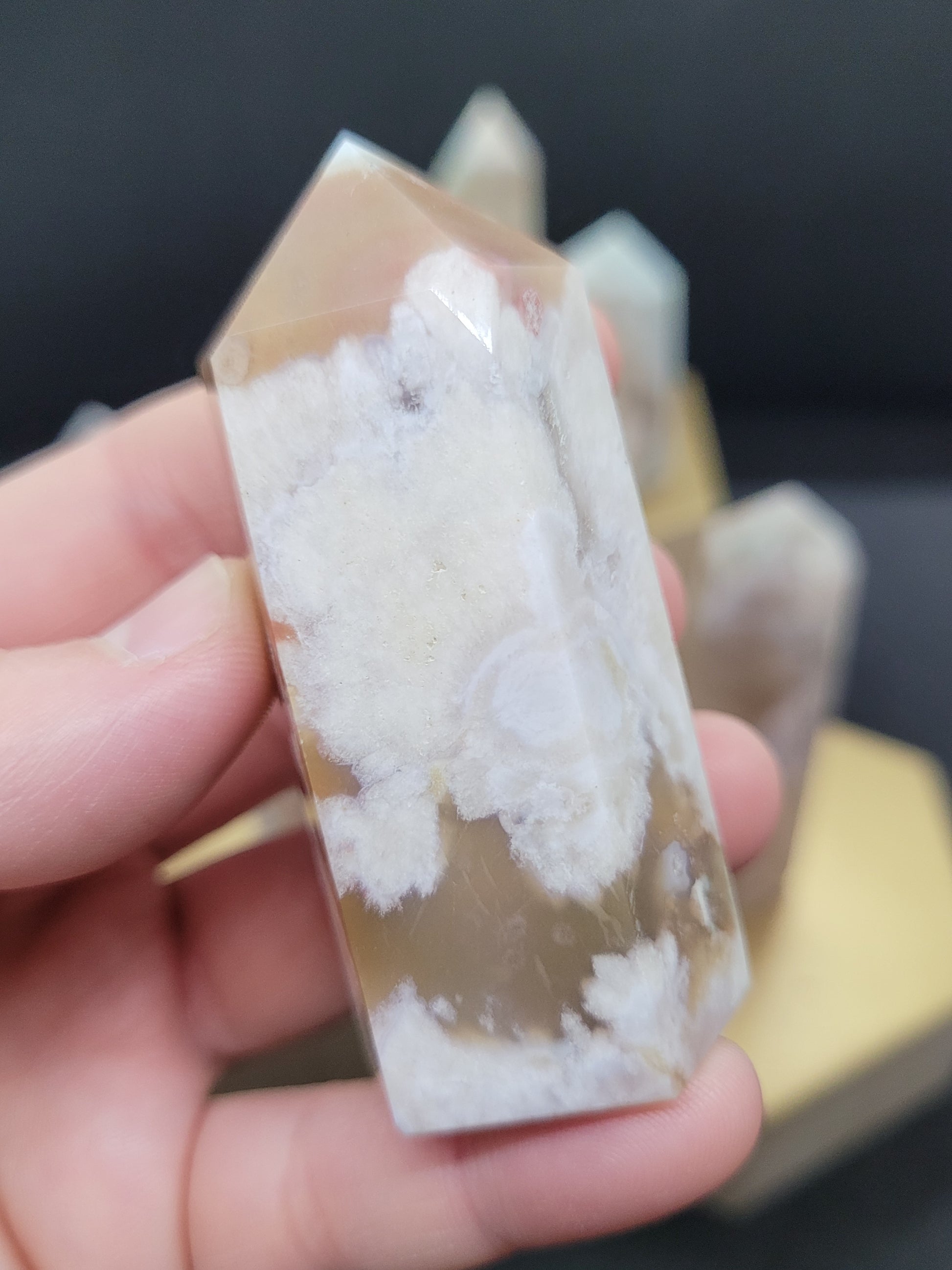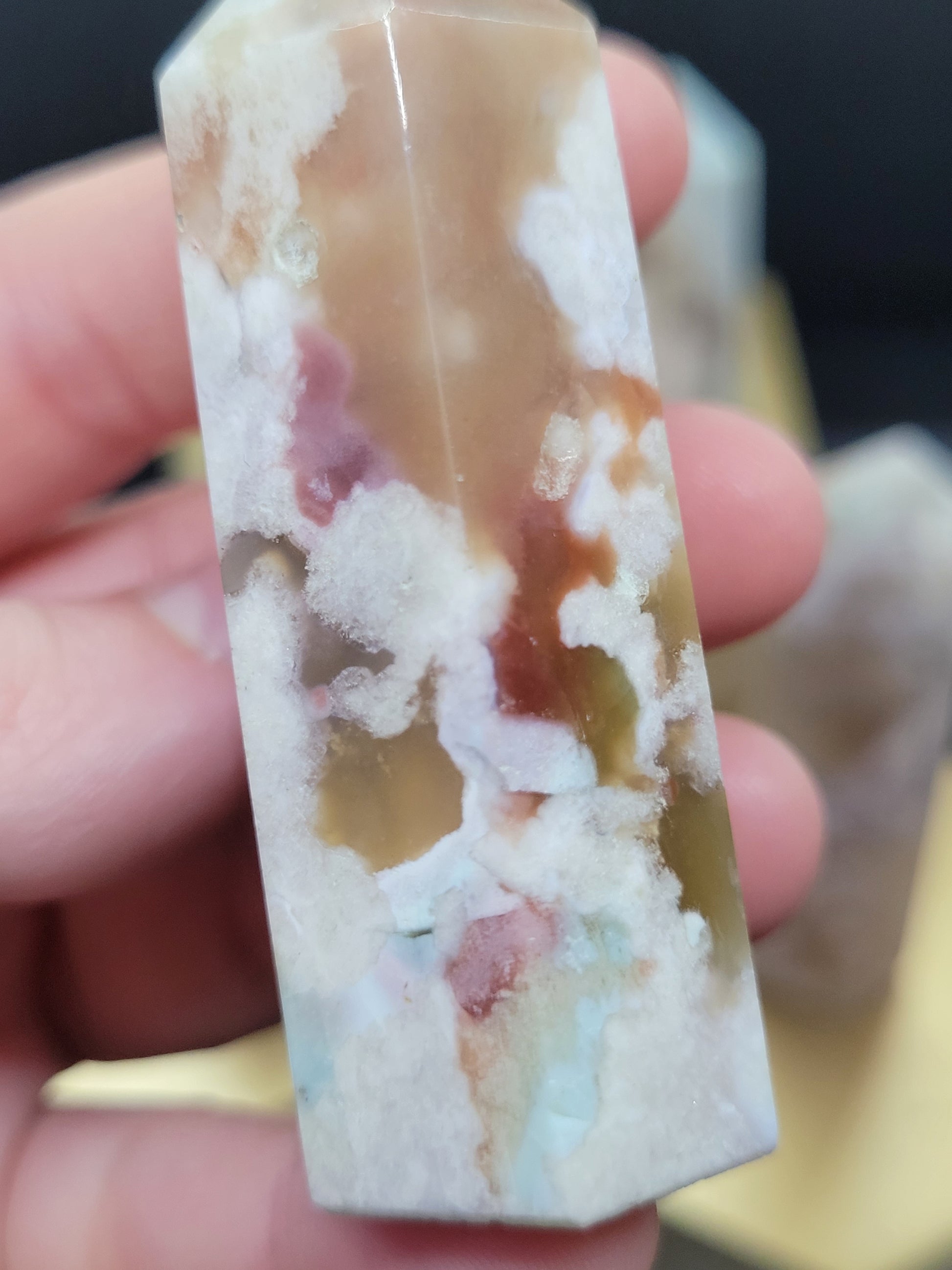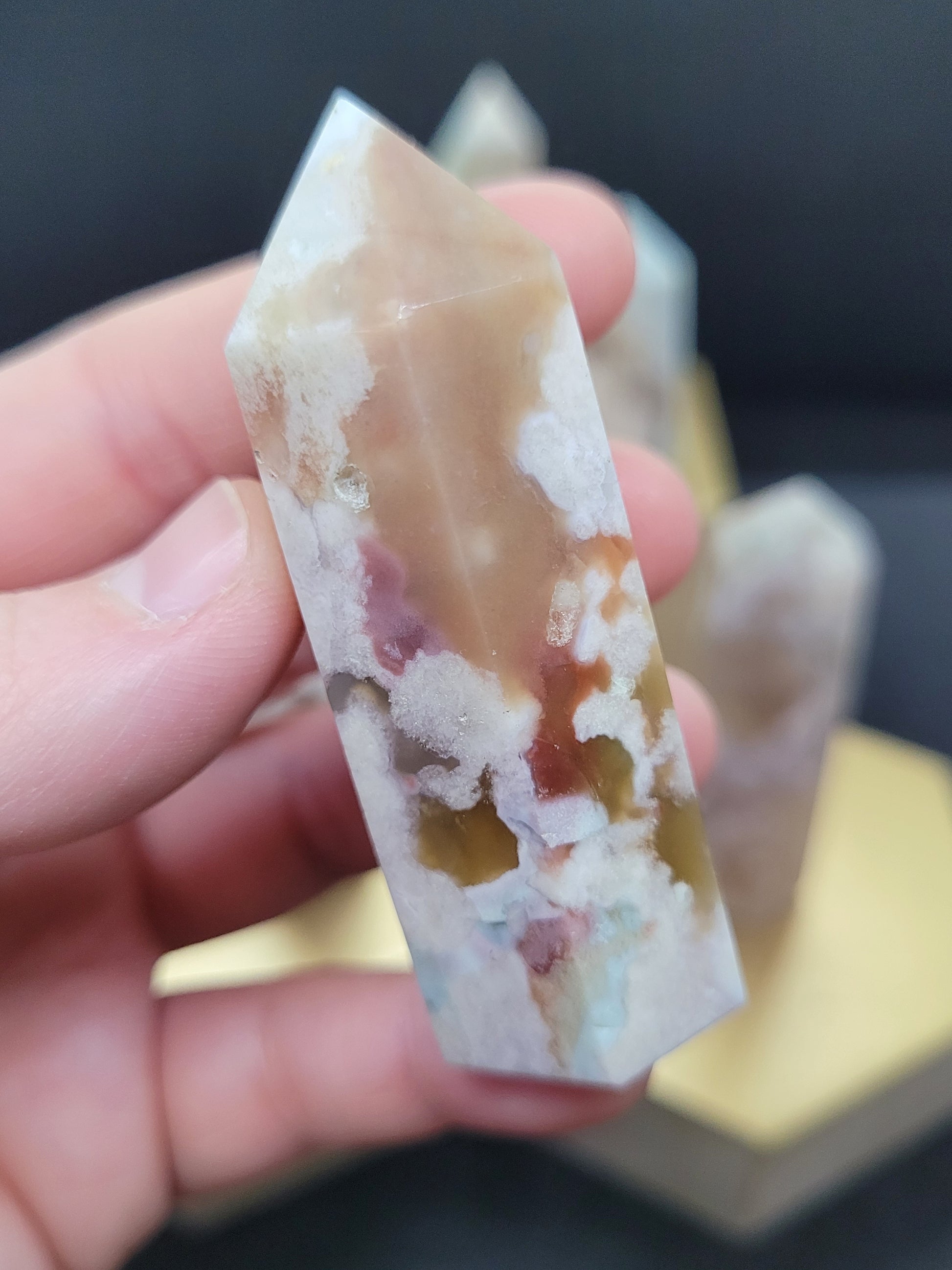 These Small Blue Flower Agate towers are charming and perfect for any space. Measuring between 2.1-3 inches tall, they are a symbol of new beginnings, growth, and transformation. As experts in their field, these agate towers are adorned with delicate flower blooms and carry properties that promote personal development. With an open heart, clarity, and renewed commitment, they can help you reach your goals and fulfill your potential. The heart and throat chakras are especially affected by these beautiful pieces.