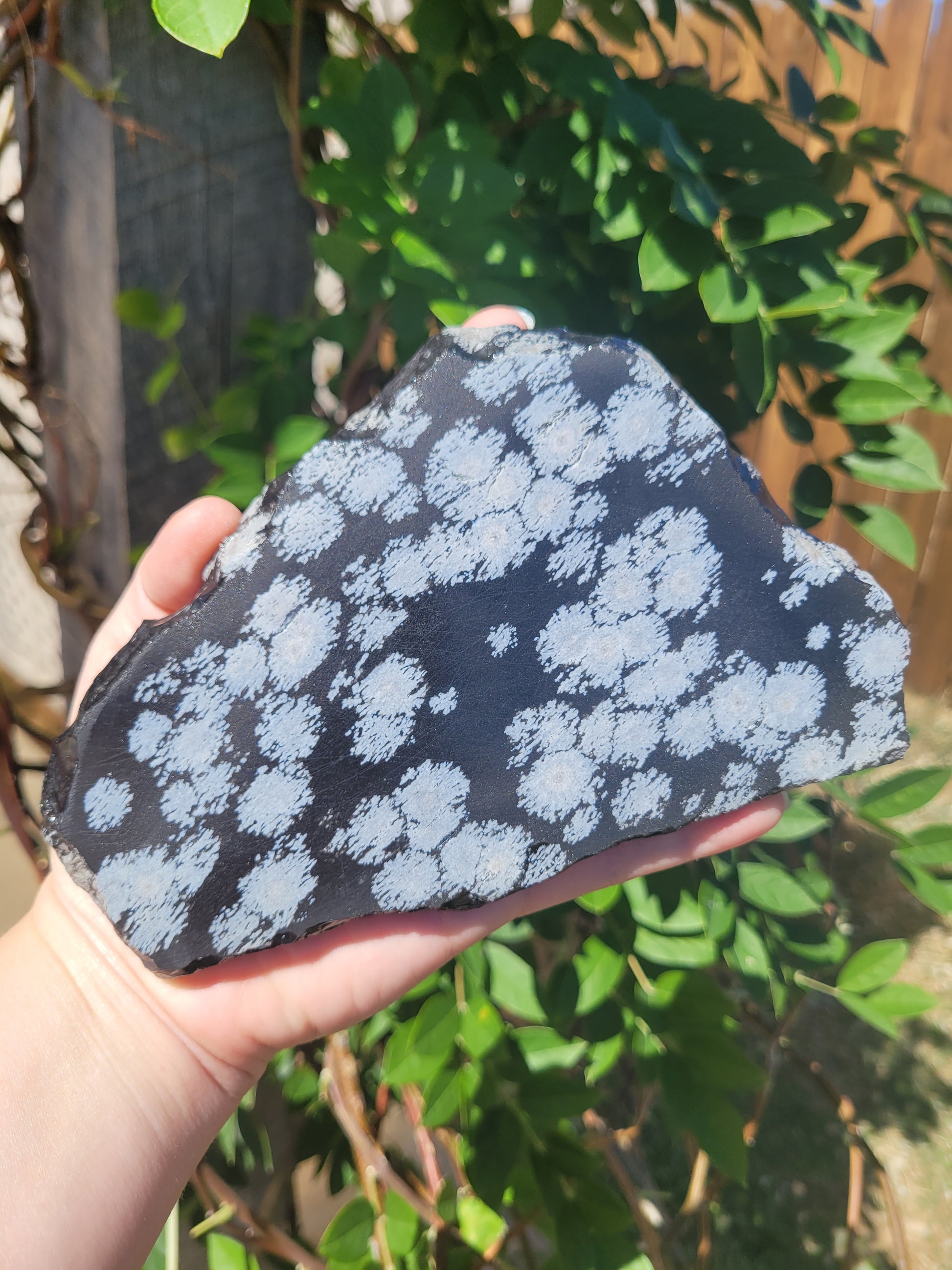 Raw Snowflake Obsidian Slabs are elegantly designed with stunning "snowflake" patterns. These volcanic glass slabs provide various metaphysical properties such as purification, balance for body, mind, and spirit. With the ability to identify and let go of unhealthy thought patterns, they promote dispassion and inner centering. The slabs empower isolation and loneliness, aiding in peaceful meditation and surrender. Snowflake Obsidian is also known to help embrace change and break old habits while keeping the body, mind, and spirit in harmony, even during chaotic times. It truly is a versatile stone for inner growth and wellbeing.