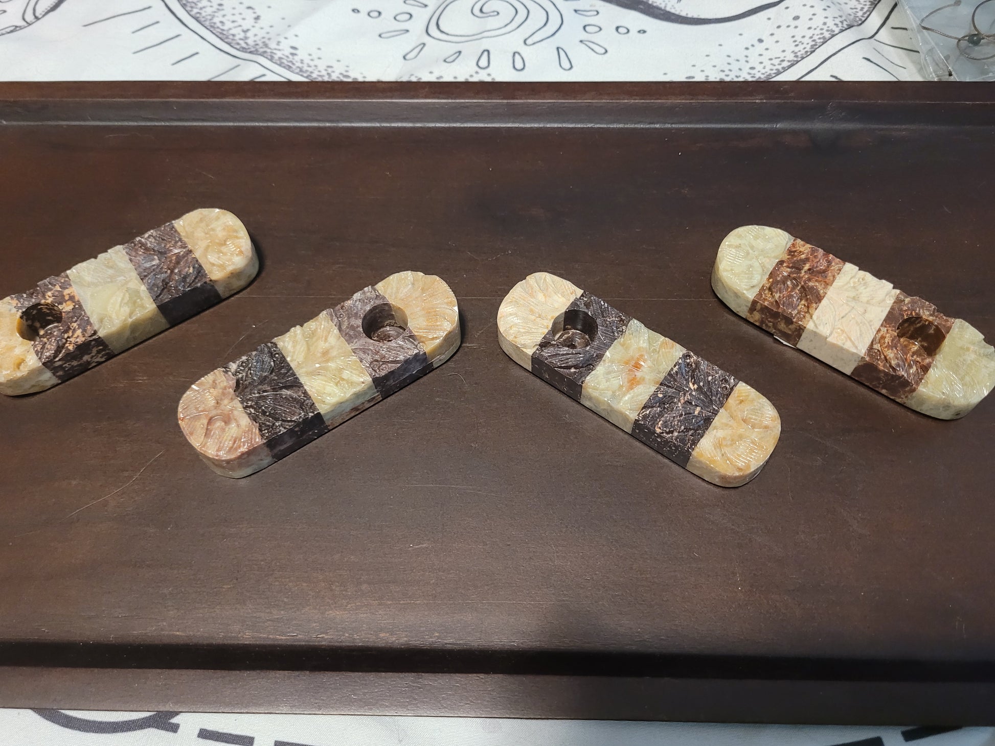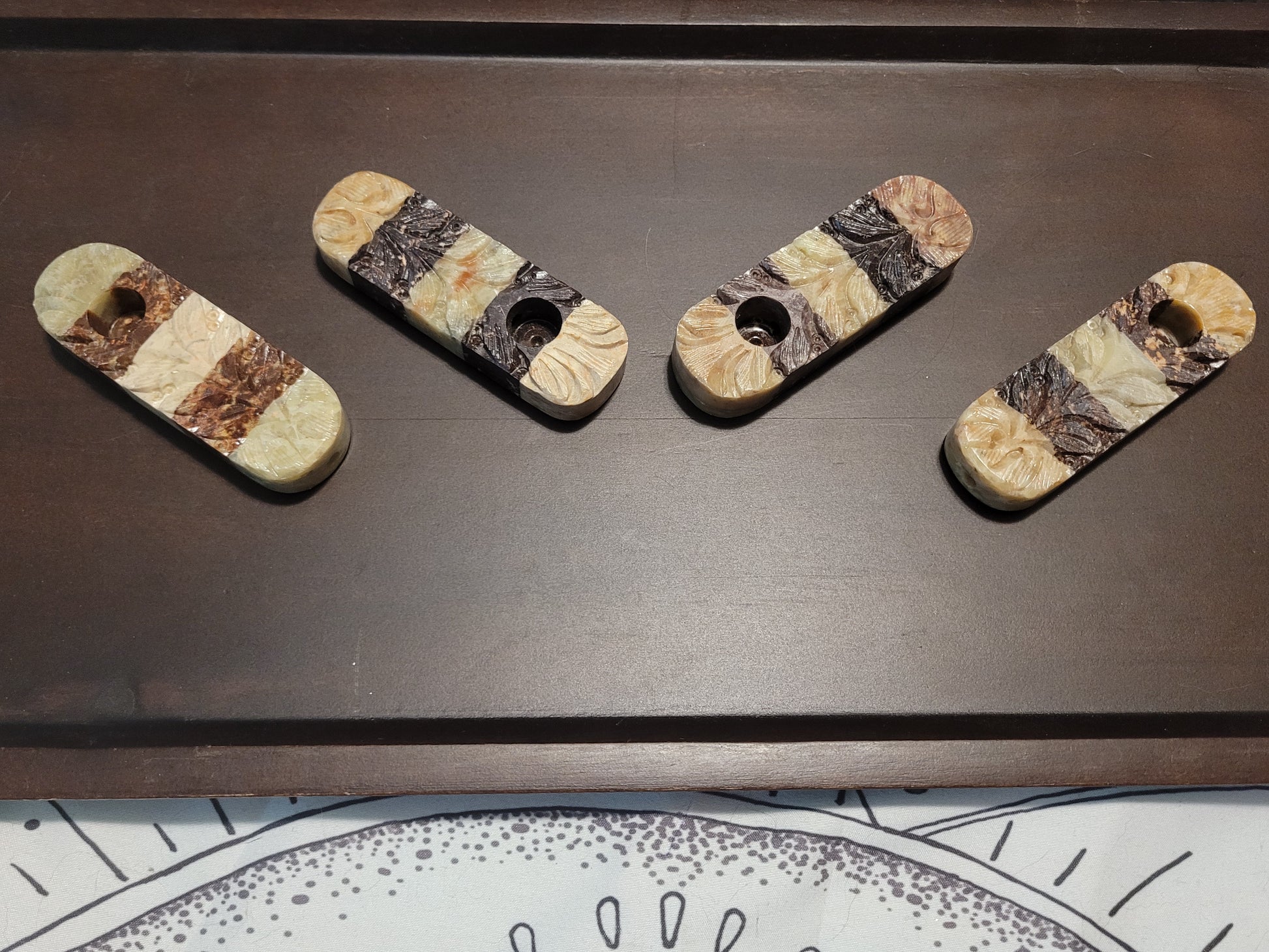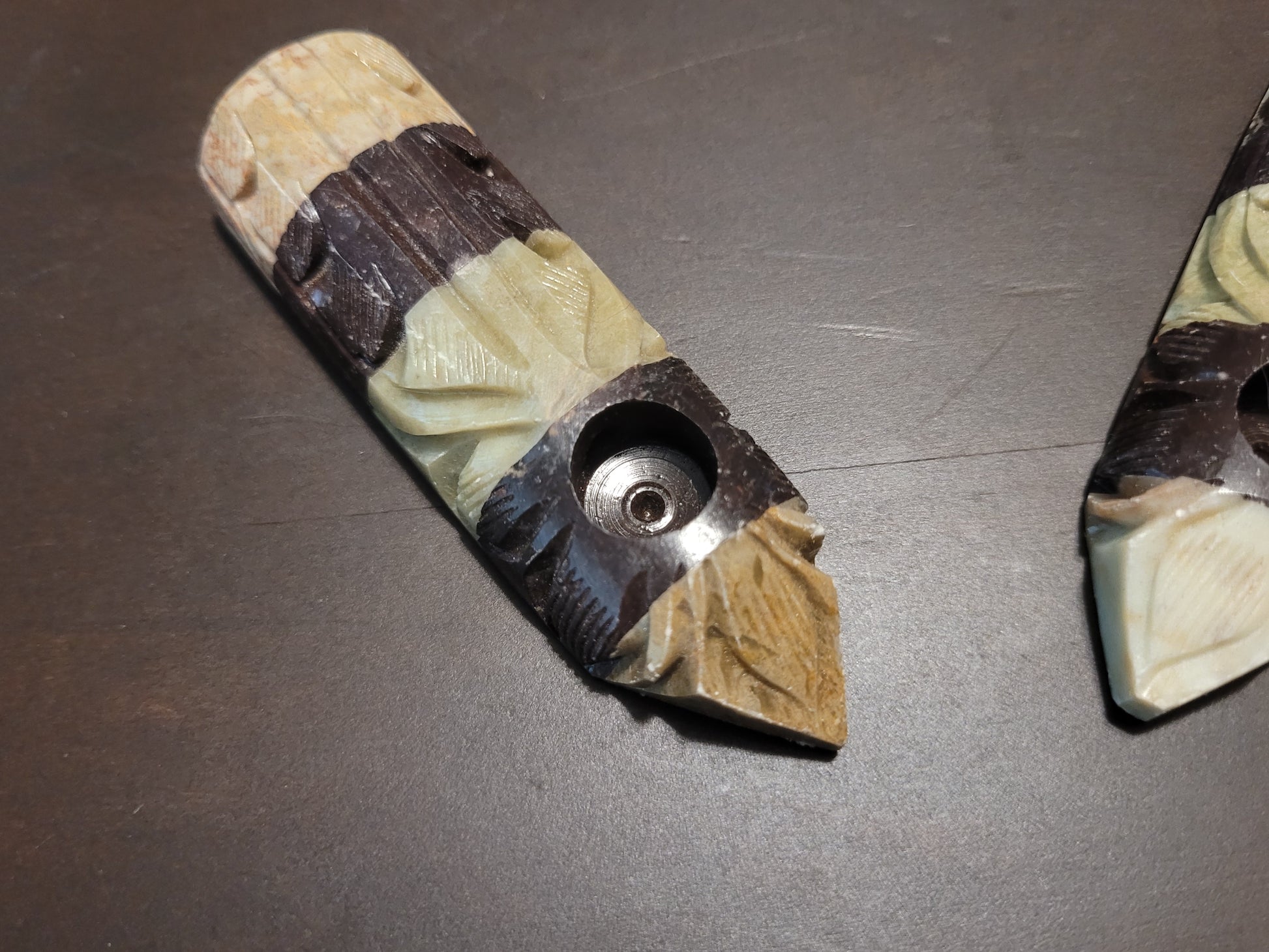 Discover four uniquely crafted soap stone pipes, each featuring detailed carvings. Designed strictly as collectible novelties, these pipes are not intended for actual smoking use.