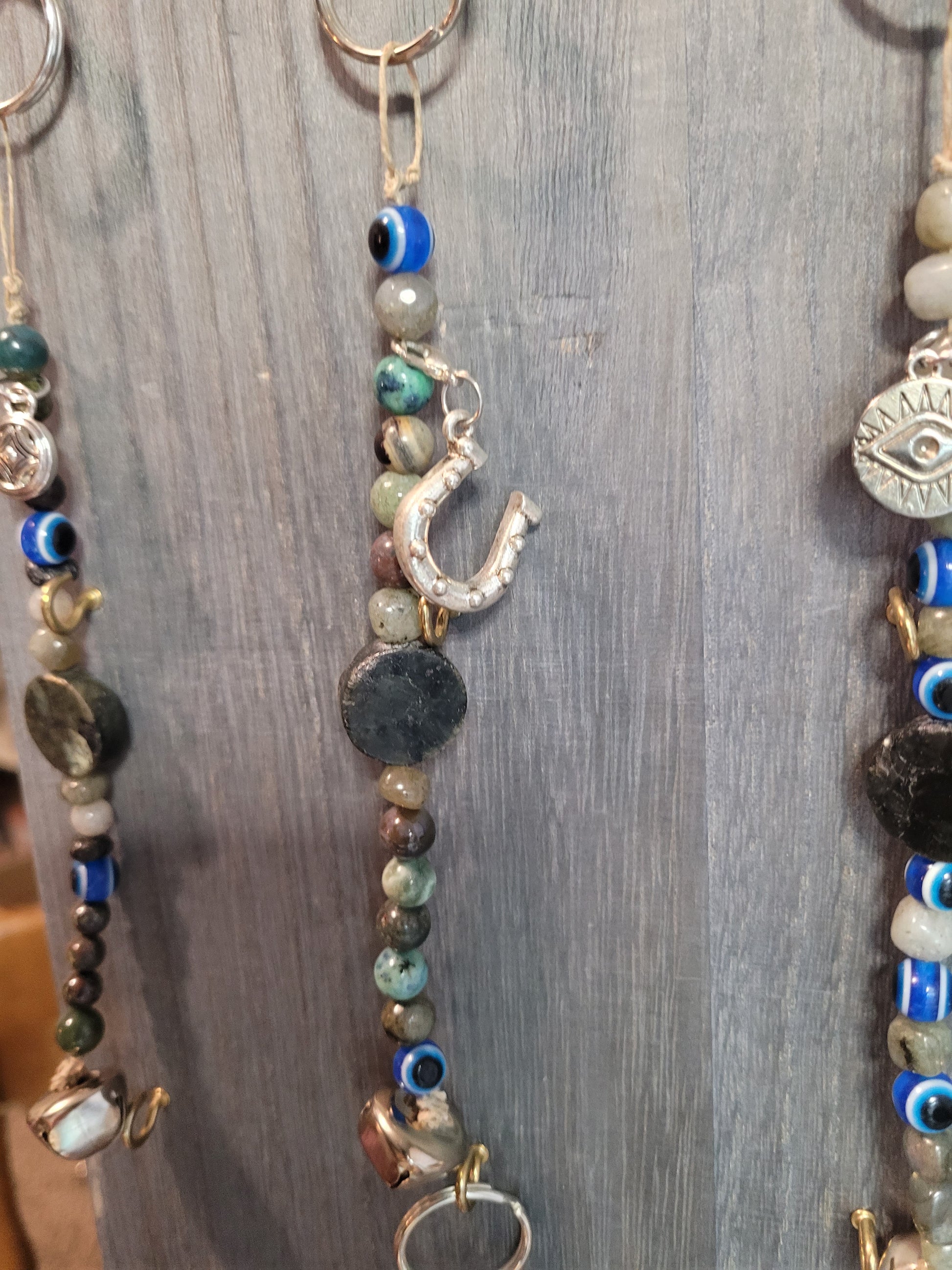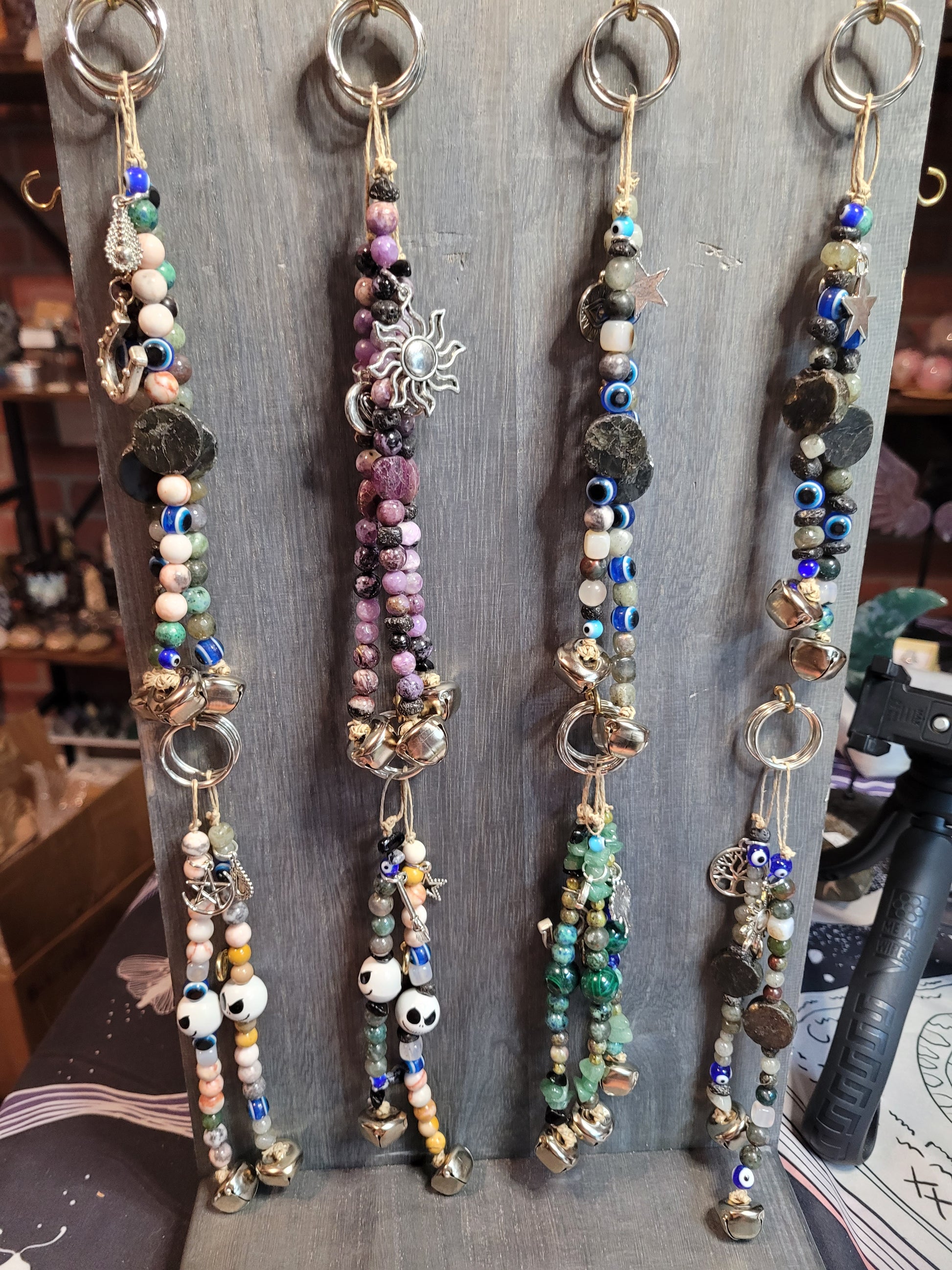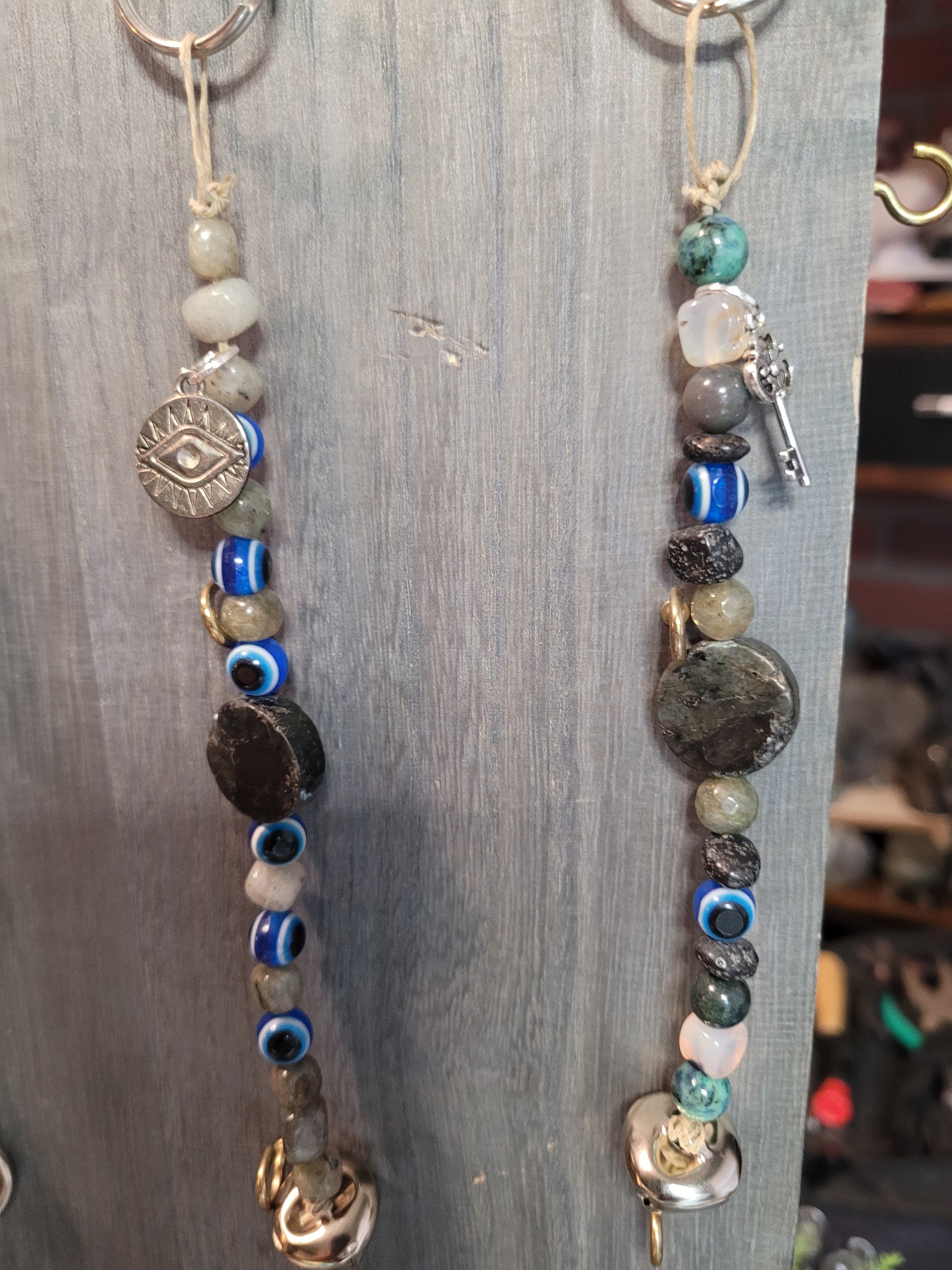 Handcrafted Witchy Charm Bell Keychains combine copper and silver wire with a selection of crystal beads. Each keychain features a metal bell and charm attached to a sturdy metal ring. The materials include Ocean Jasper, Malachite, Red Vein Jasper, Charoite, Obsidian, Snowflake Obsidian, synthetic Ruby, Green Aventurine, Agate, Rose Quartz, Strawberry Rose Quartz, African Bloodstone, Dragon’s Blood, Peridot, Lava Stone, Labradorite, Wooden Beads, Pink Zebra Jasper, Chrysocolla, Azurite, Mookaite, Pyrite, and Glass Evil Eye beads.
